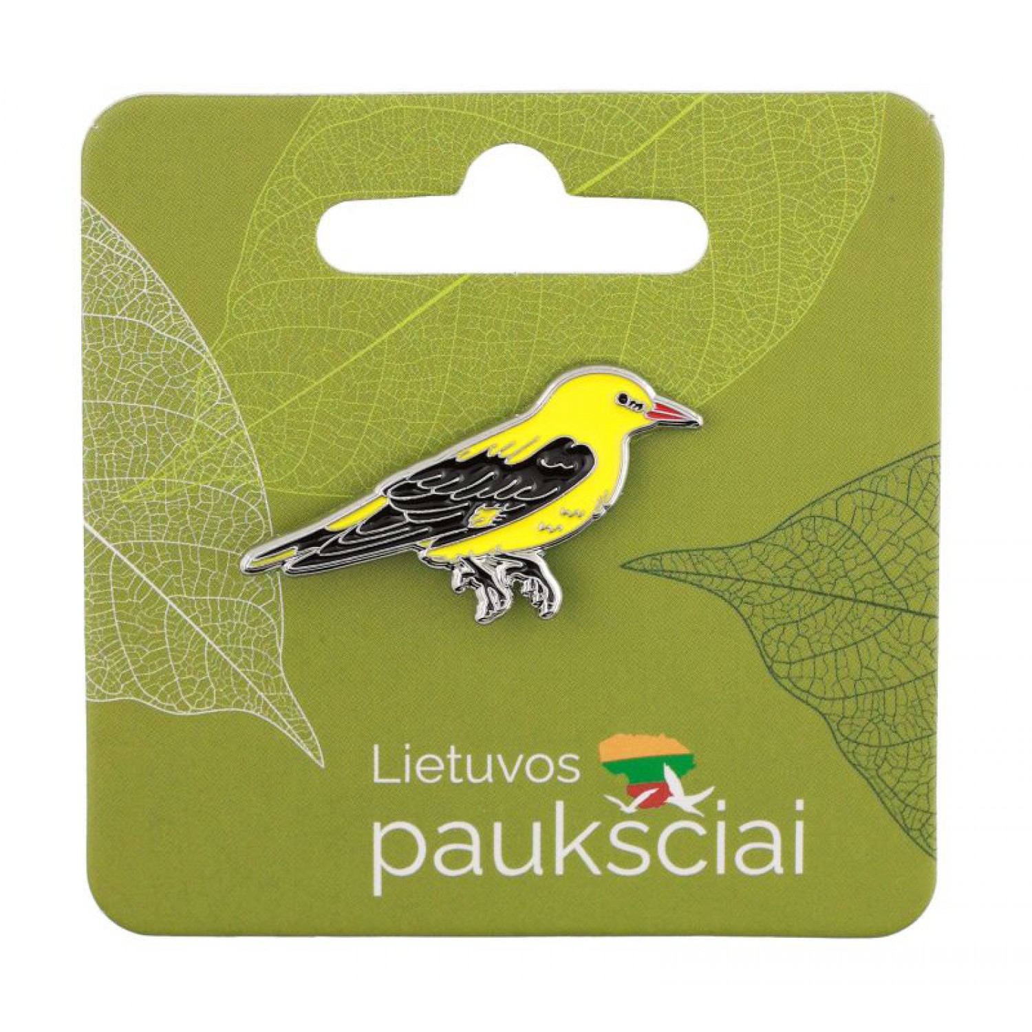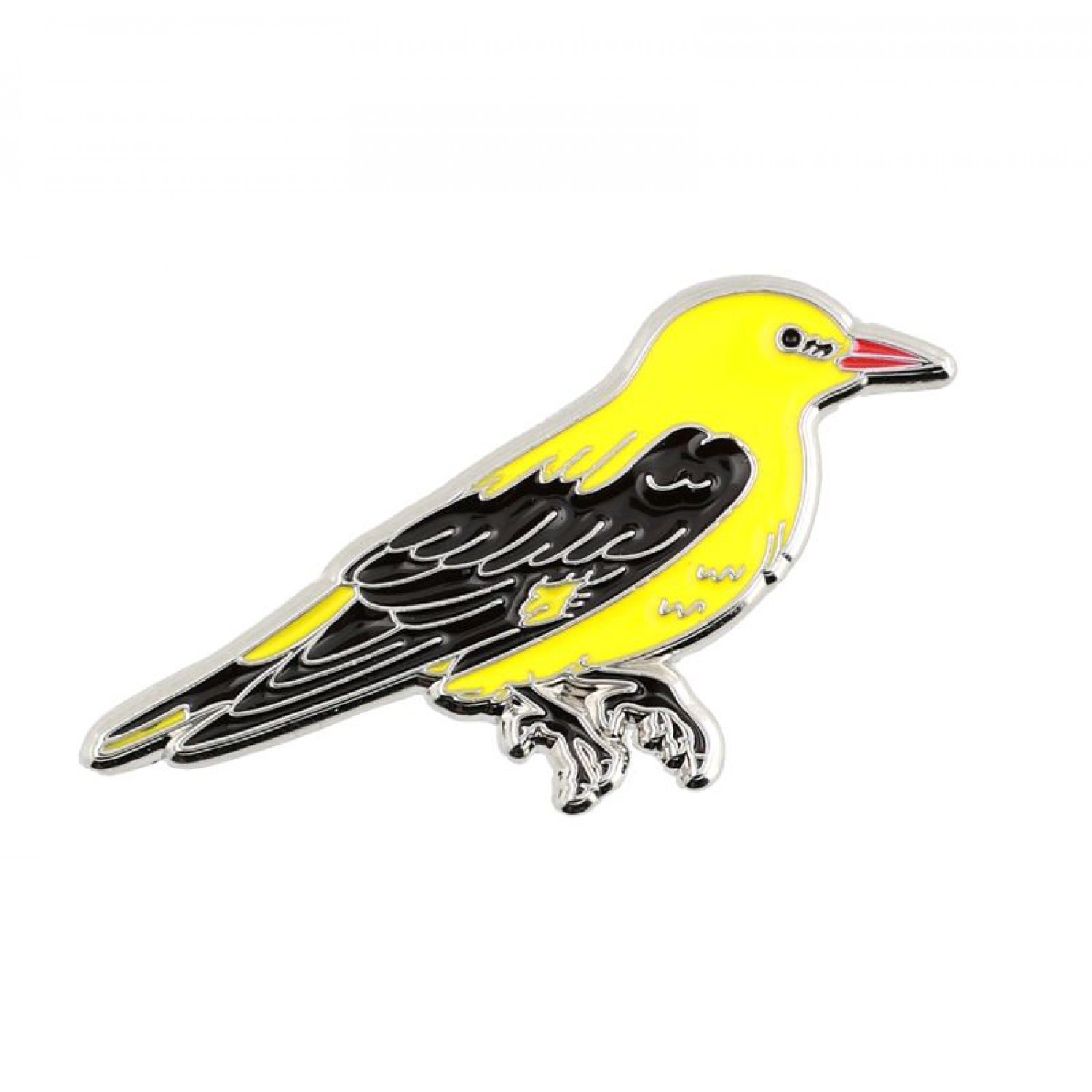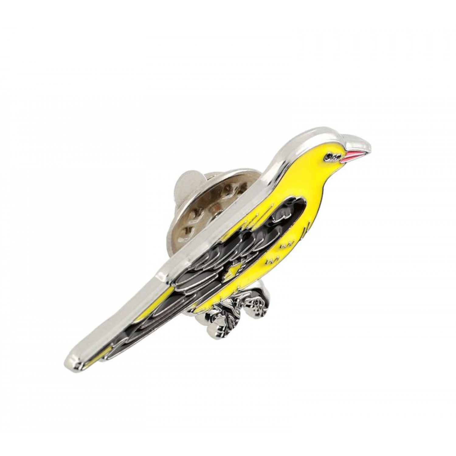 Metal pin featuring the Eurasian golden oriole (Oriolus oriolus).