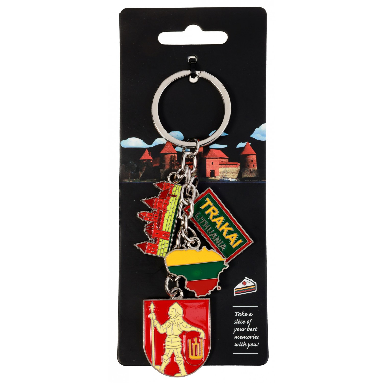 A colorful and symbolic 4-part keychain reflecting the identity of Trakai and Lithuania. The set includes Trakai Castle, the inscription Trakai Lithuania, the map of Lithuania with its flag, and the coat of arms of Trakai city. Made of metal with an enamel coating, it is a sturdy and durable accessory. Suitable for souvenir retailers.