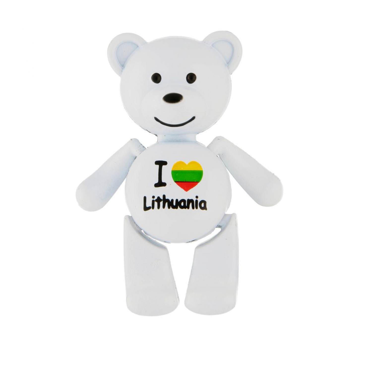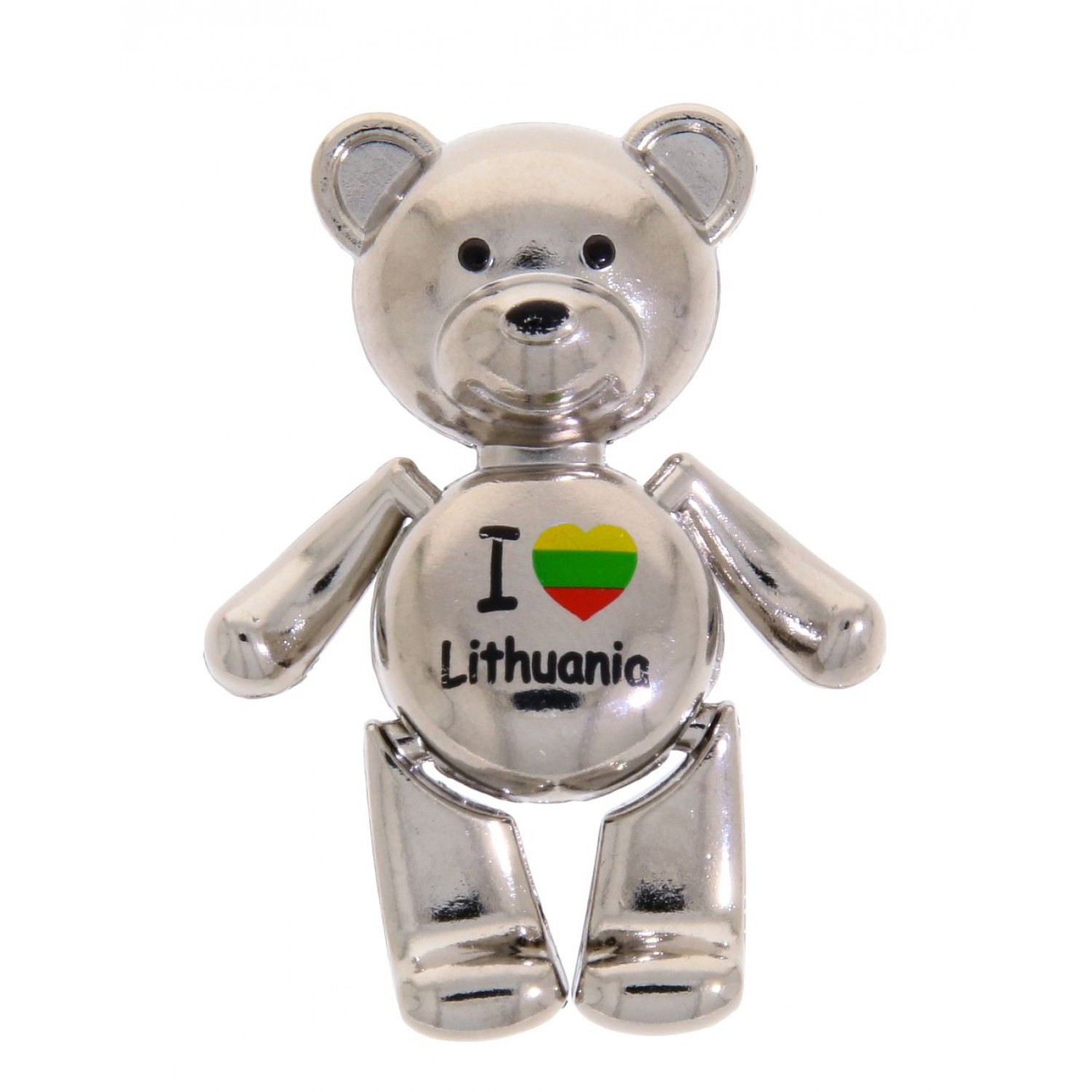 This stylish metal magnet features a bear and the inscription I love Lithuania. Perfect for the souvenir trade, it is durable, lightweight, and visually attractive. It is available in two color options: white and silver. It easily attaches to any metal surface, making it a practical and appealing choice for wholesale souvenir sales.
