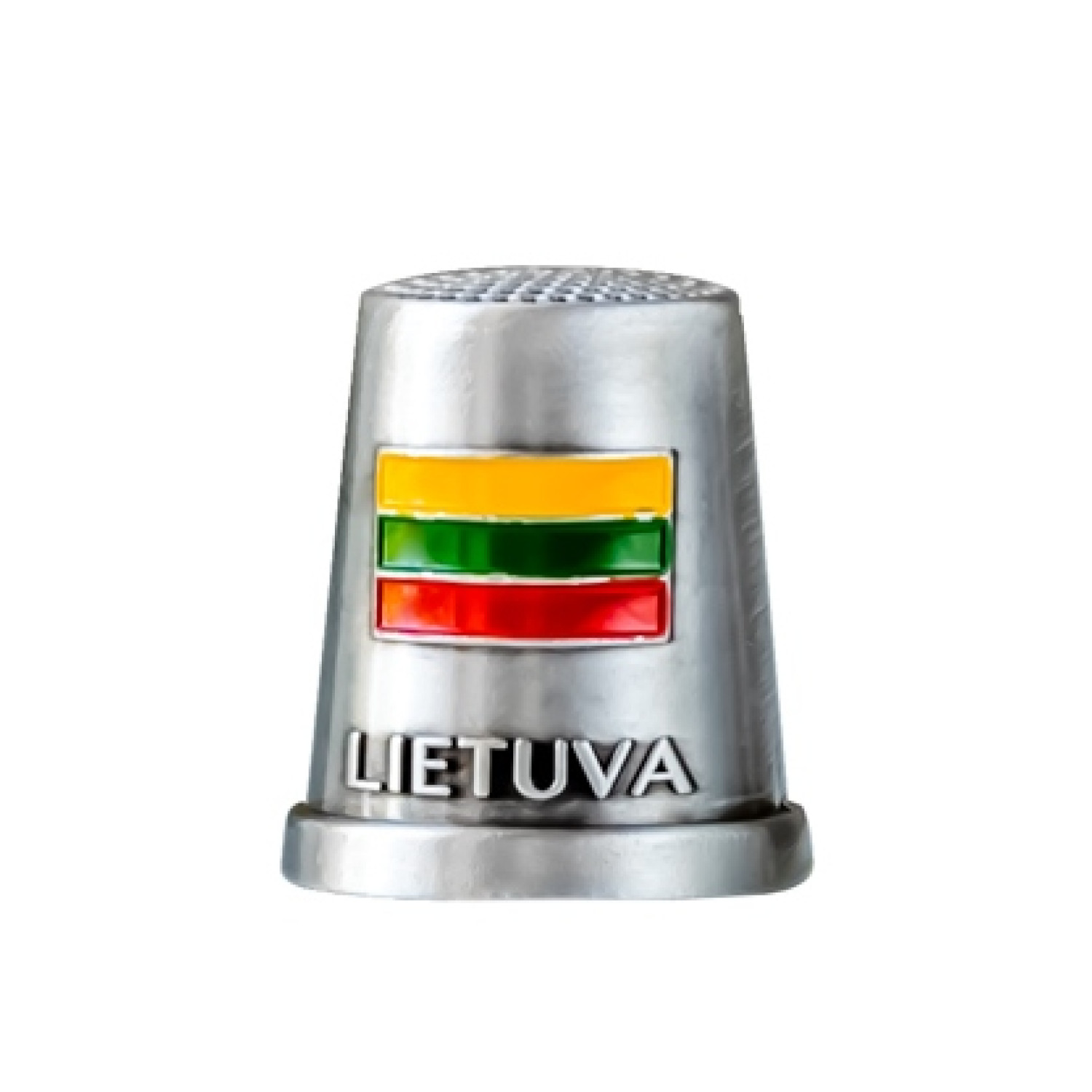 Metal souvenir thimble with Lithuanian flag, Vytis, and Lithuania inscription