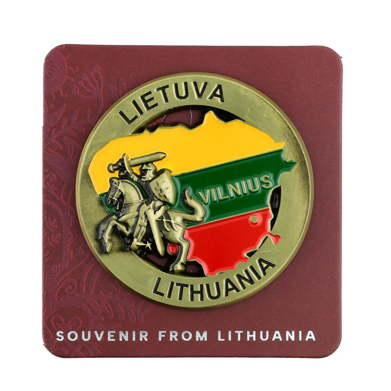 A round metal fridge magnet featuring the colored map of Lithuania with the Vytis (the Knight) symbol. Includes inscriptions Lietuva and Lithuania, with Vilnius marked. Great for souvenir collections or retail. Available in bronze or silver color.