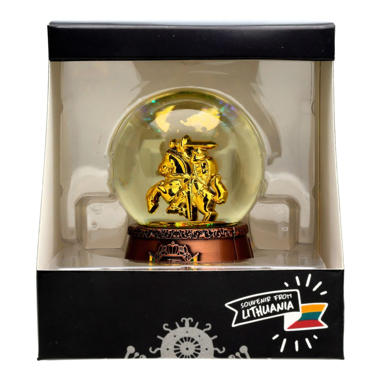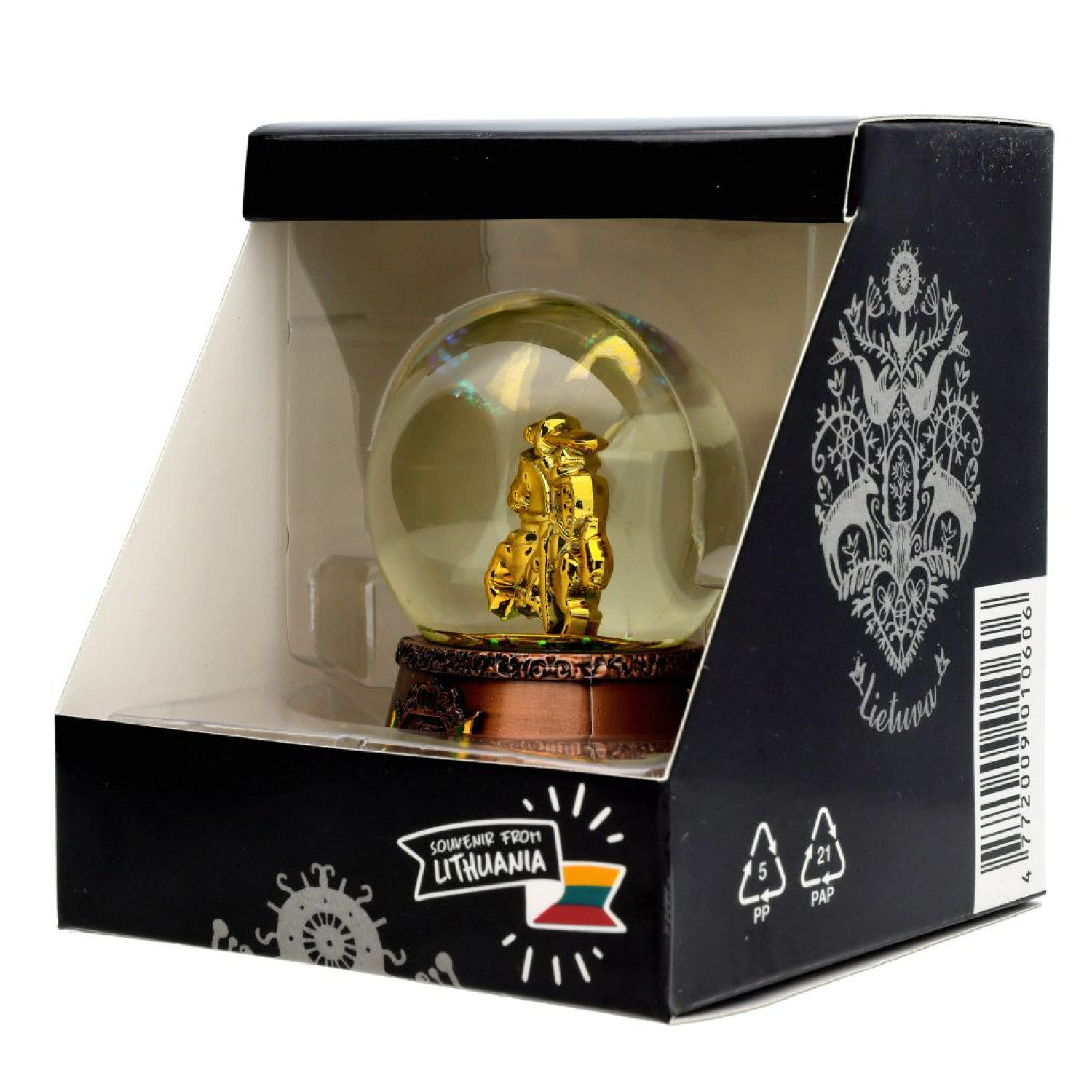 A decorative snow globe featuring the outline of Lithuania, the national coat of arms, and a golden Vytis inside. The base is made of quality materials and decorated with Lithuanian symbols. It is a great choice for souvenir retail.