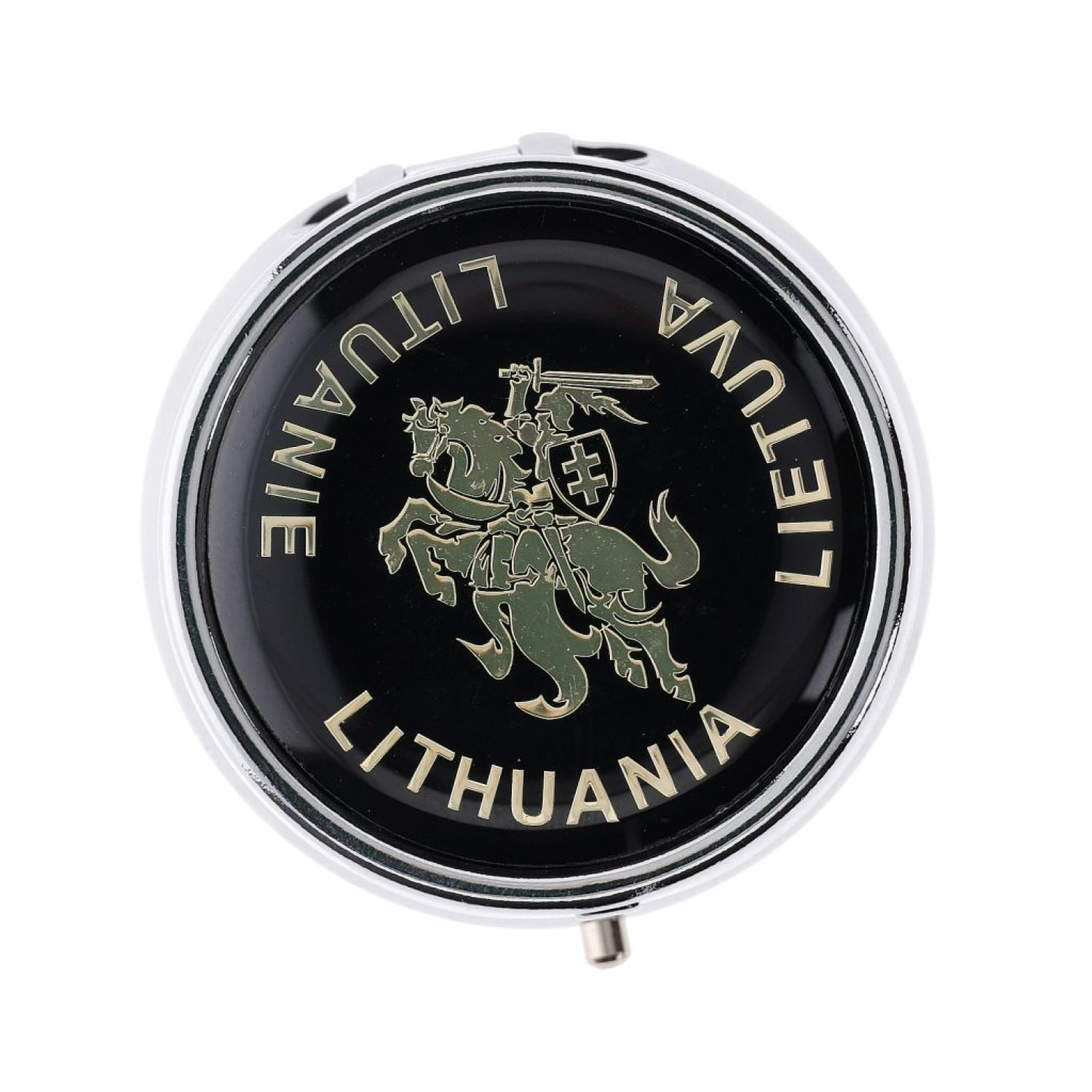 A practical and compact souvenir pill box featuring the Vytis (Lithuanian coat of arms) on a black background. It is ideal for carrying pills during travel or daily use. This Lithuanian souvenir combines functionality with national symbolism, making it a meaningful and useful gift. Great for patriotic gifts, travel accessories, or everyday convenience.