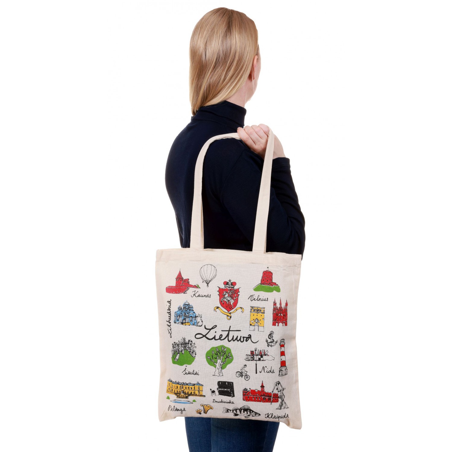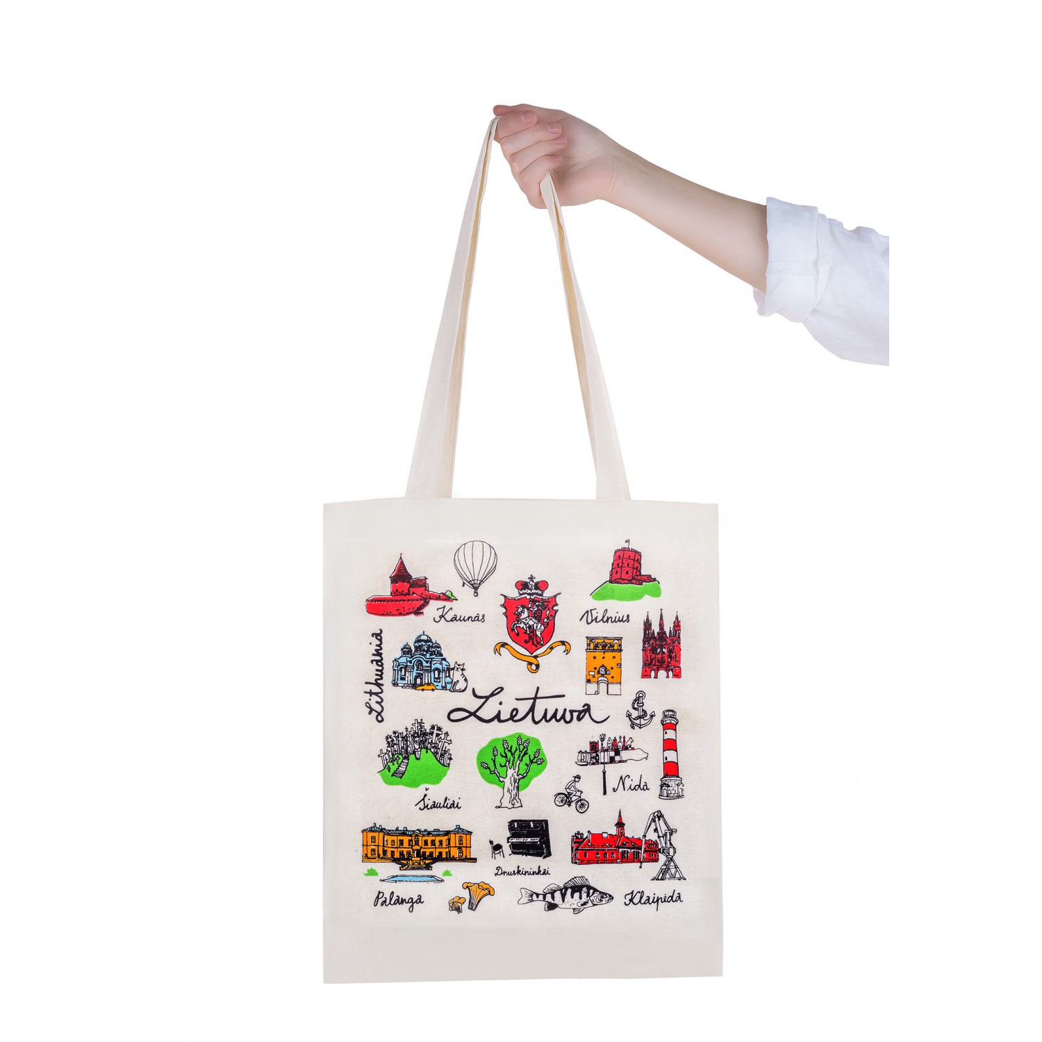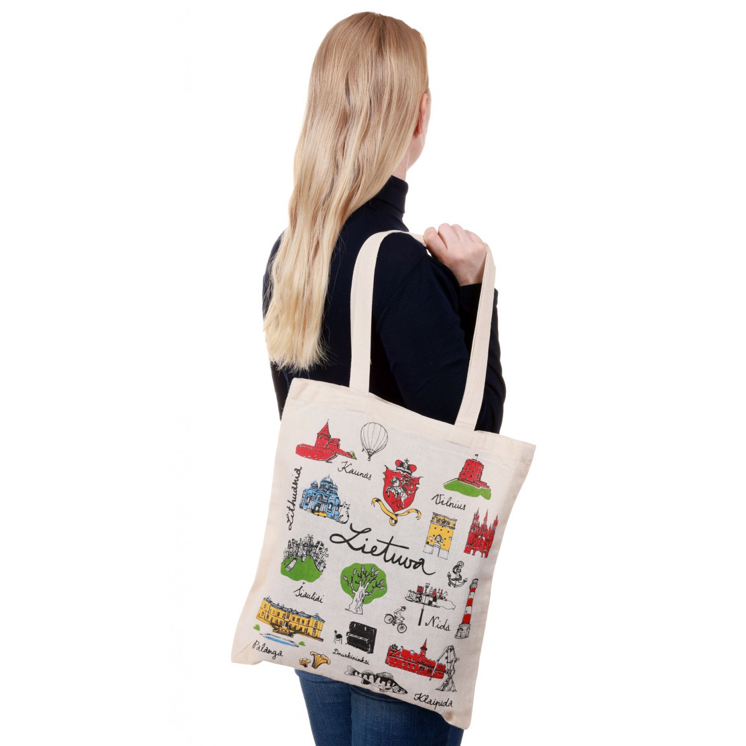 Medvilninis maišelis, dekoruotas stilizuotais Lietuvos miestų simboliais – puikus pasirinkimas tiek kasdieniam naudojimui, tiek kaip originali dovana. Dydis – 35 x 40 cm, tad patogu nešiotis tiek smulkius daiktus, tiek dokumentus ar knygas. Ilgos 68 cm rankenos leidžia patogiai nešioti maišelį ant peties.