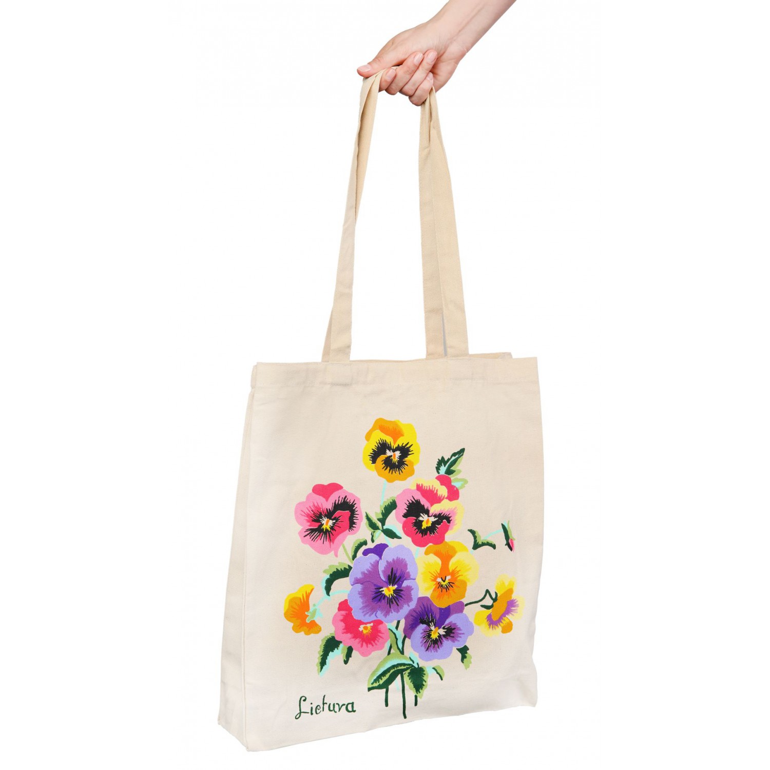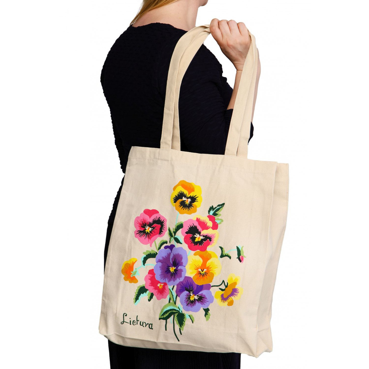 Pirkinių maišelis, pasiūtas iš natūralios spalvos storos medvilnės audinio. Dydis 35 x 40 cm, rankenos – 68 cm, todėl patogiai nešiojamas ant peties. Medžiaginis pirkinių maišelis Našlaitės dekoruotas gražiais našlaičių violetų motyvais, kurie suteikia jam unikalumo ir švelnumo.