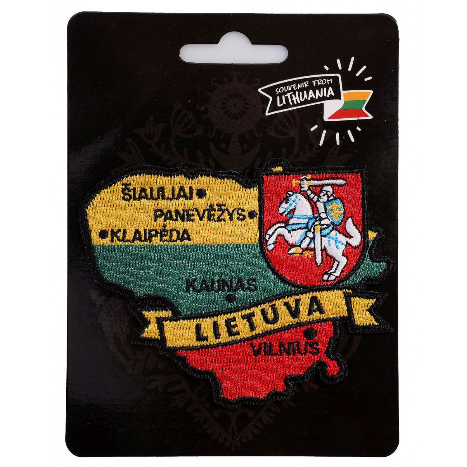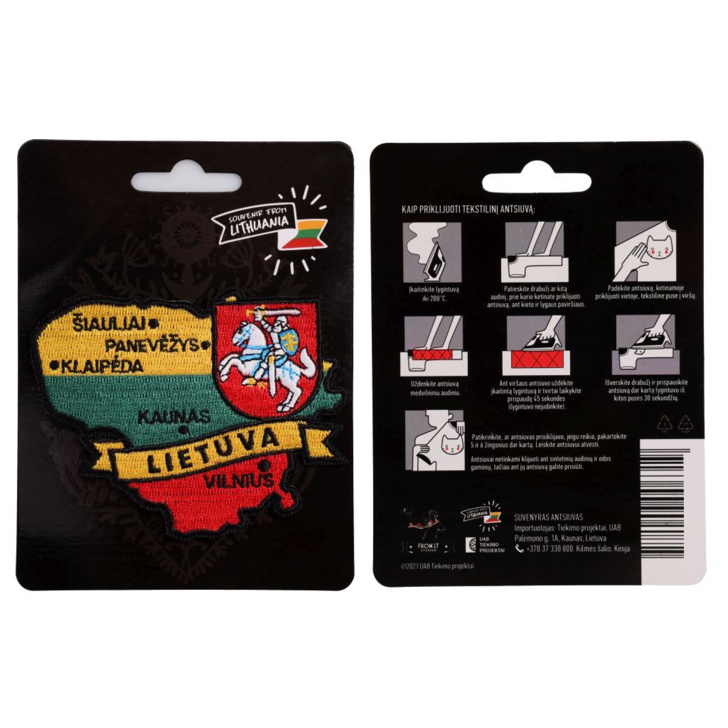 Antsiuvas Lietuvos žemėlapis su Vyčiu ir užrašu Lietuva – kokybiškas medžiaginis aksesuaras, išreiškiantis patriotizmą. Vaizduoja Lietuvos žemėlapį su Vyčiu ir užrašu, lengvai priklijuojamas karštu lygintuvu. Puikiai tinka drabužiams, kuprinėms, kepurėms ar uniformoms. Išskirtinis suvenyras, skirtas dovanoti ar kolekcionuoti.