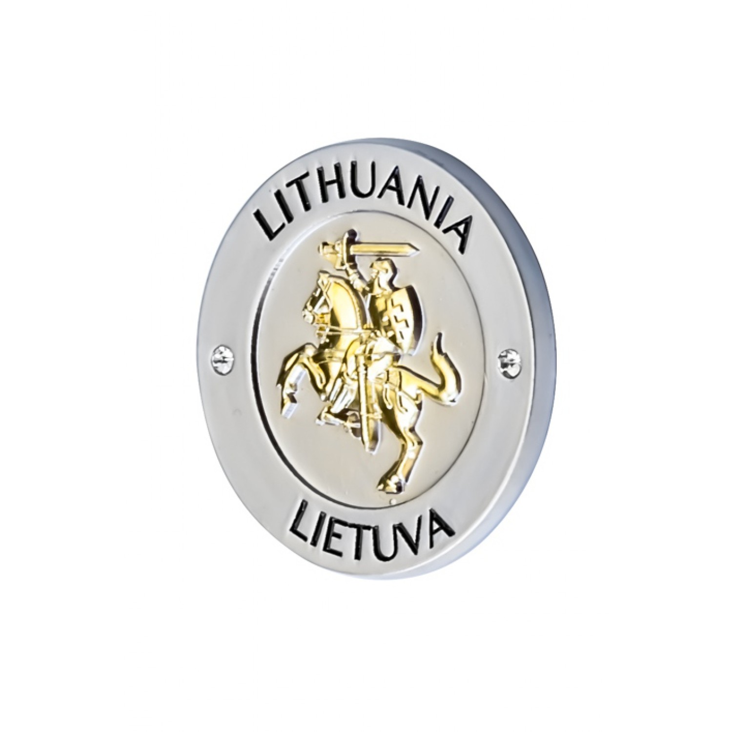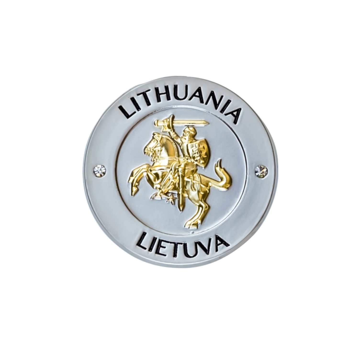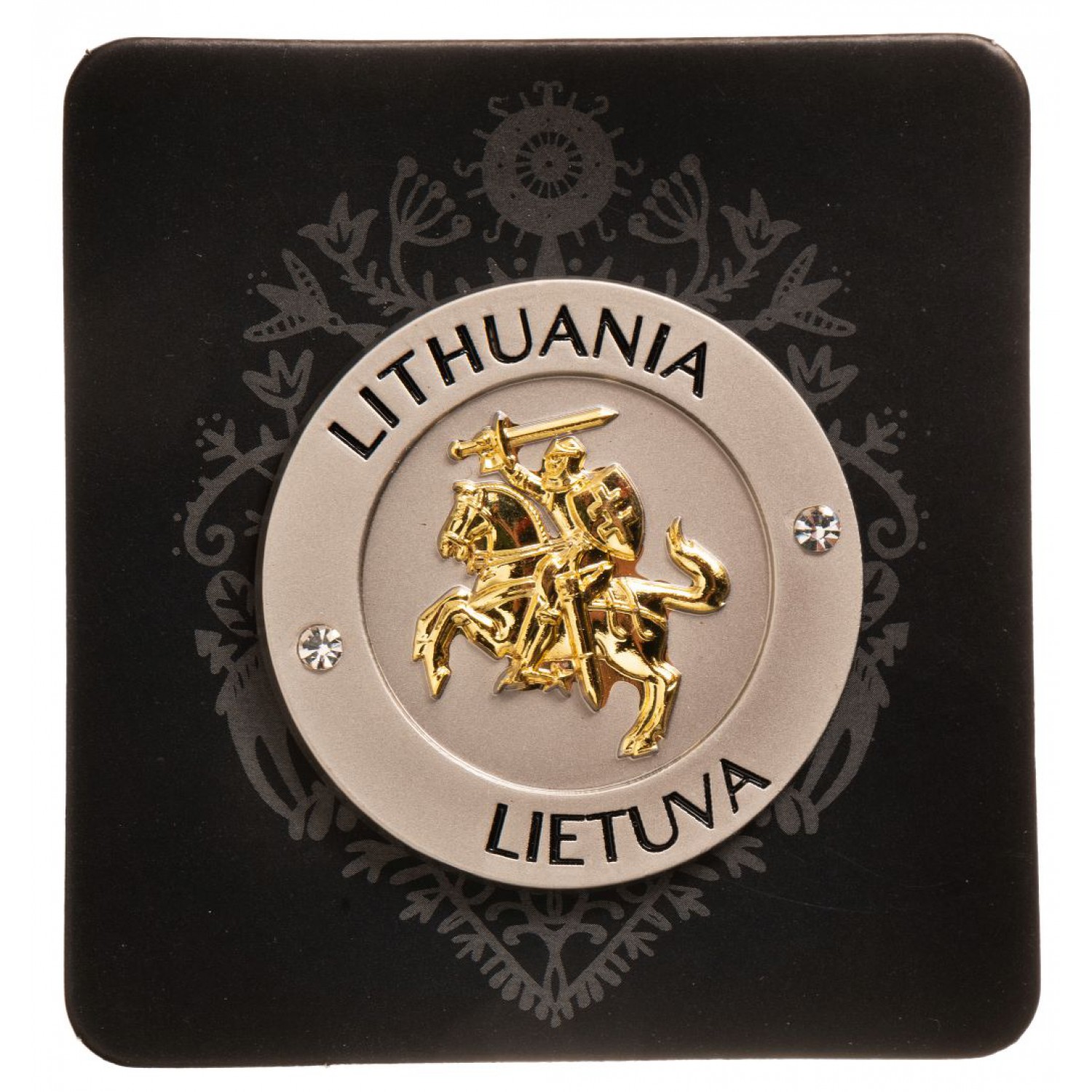 Metalinis suvenyrinis magnetas apvalios formos su auksiniu Vyčiu centre. Dekoruotas užrašais Lietuva ir Lithuania. Elegantiškas ir simbolinis suvenyras, tinkantis prekybai.