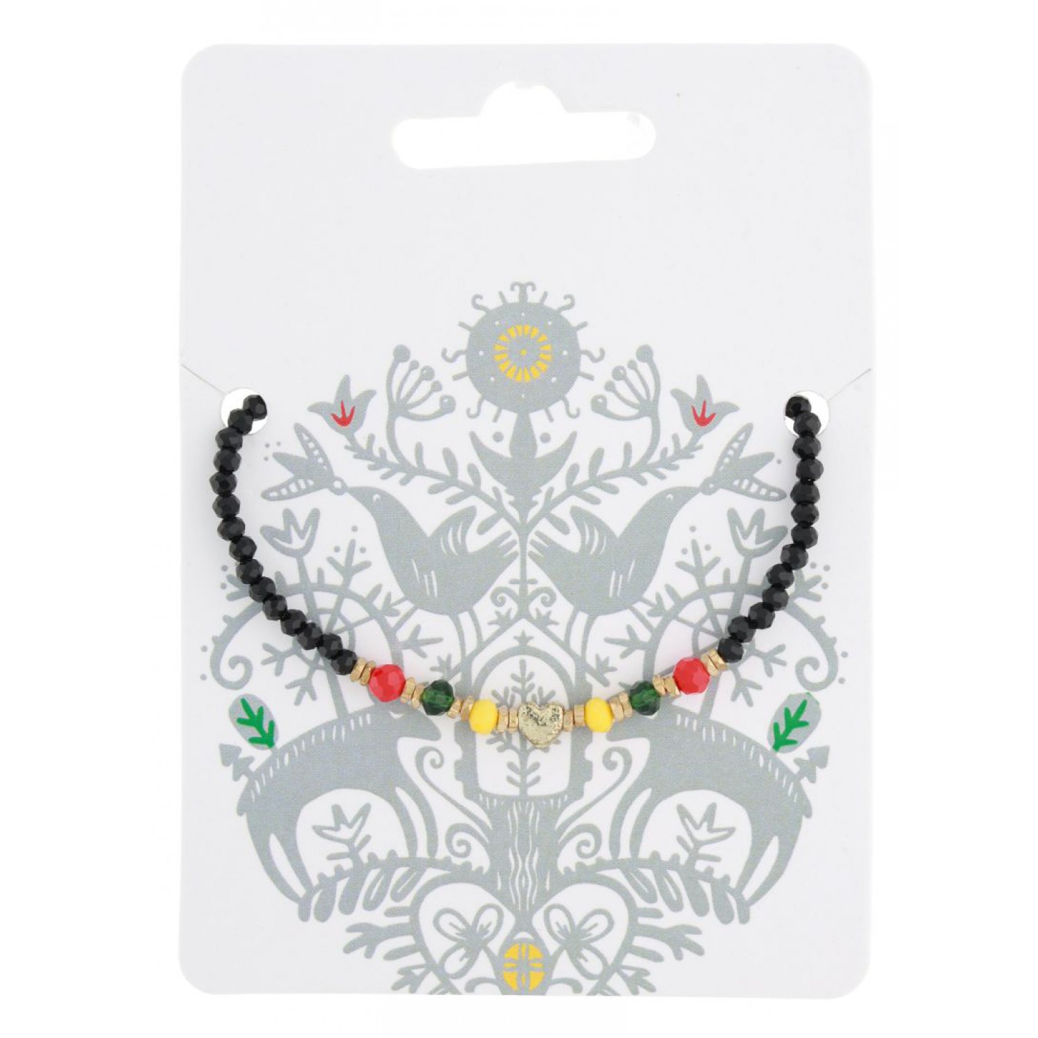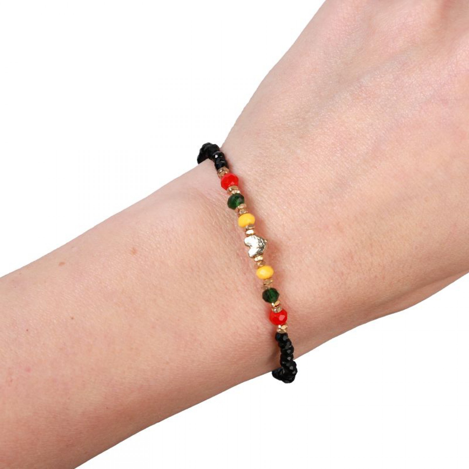 Stilinga juodų karoliukų apyrankė su mažyte širdele ir geltonos, žalios bei raudonos spalvų karoliukais – Lietuvos vėliavos spalvomis. Subtilus aksesuaras, puikiai tinkantis tiek kasdienai, tiek ypatingoms progoms. Tai nedidelė, bet reikšminga detalė, išreiškianti meilę Lietuvai.