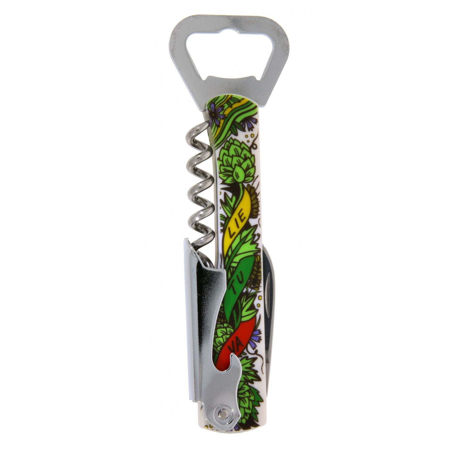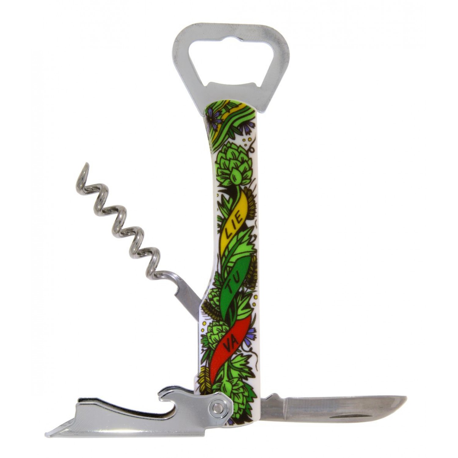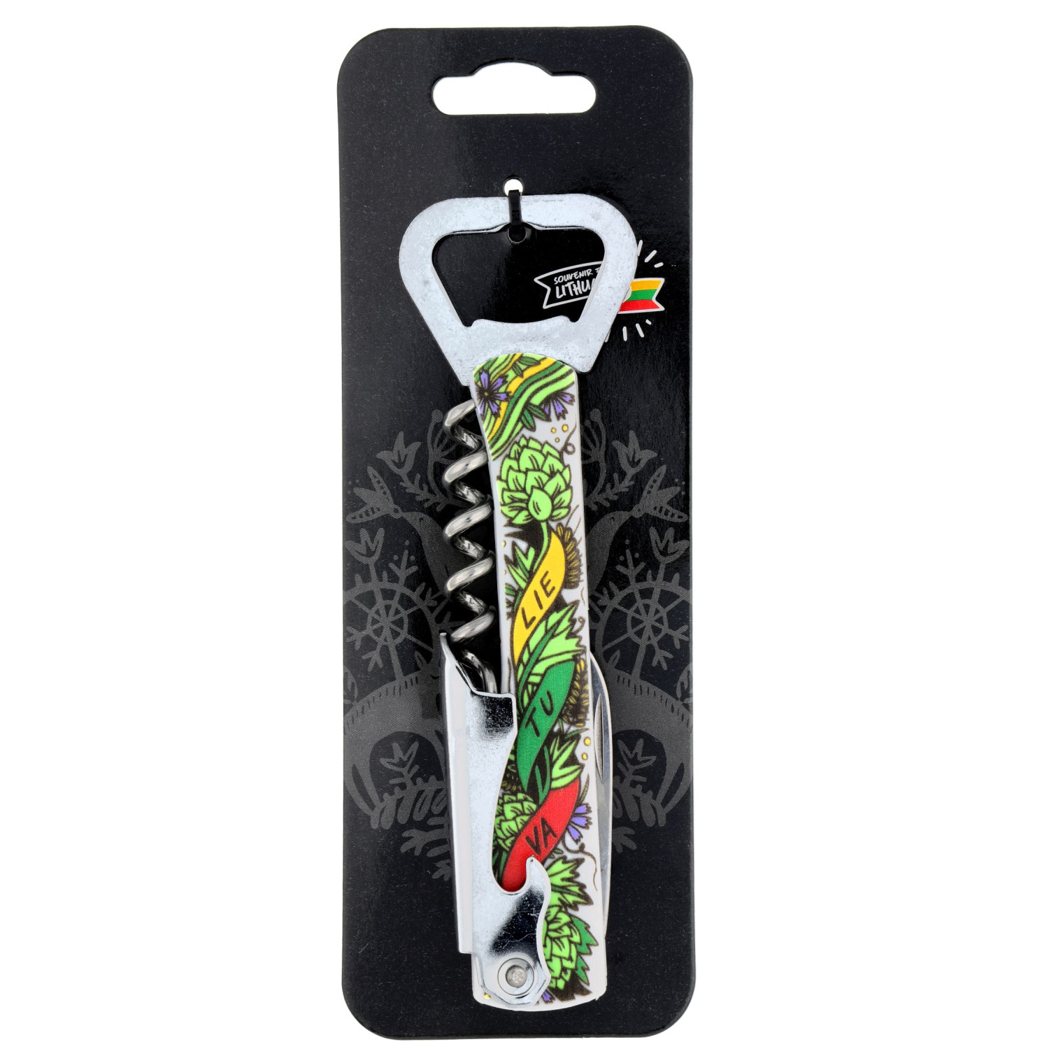 Patogus ir funkcionalus kišeninis suvenyrinis atidarytuvas-kamščiatraukis su plastiko rankena, dekoruota Lietuvos simbolika ir spalvomis. Šis įrankis skirtas butelių kamščių atidarymui ir yra patogus kasdieniam naudojimui. Lengvas ir kompaktiškas.