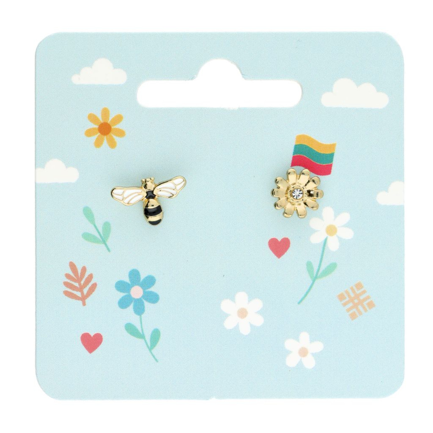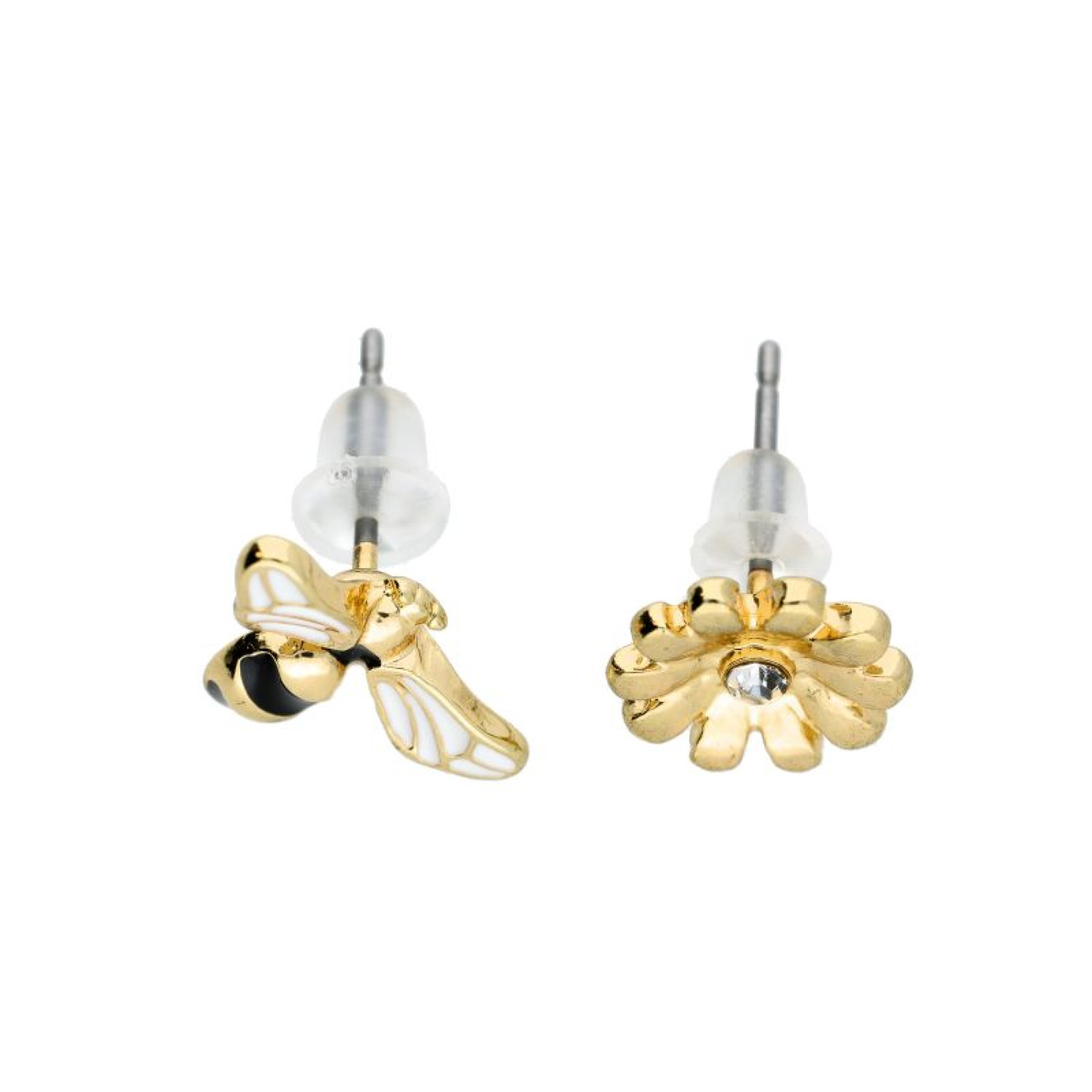 Įsegami aukso spalvos auskarai - vinukai bitė ir gėlė. Silikoninis užsegimas.