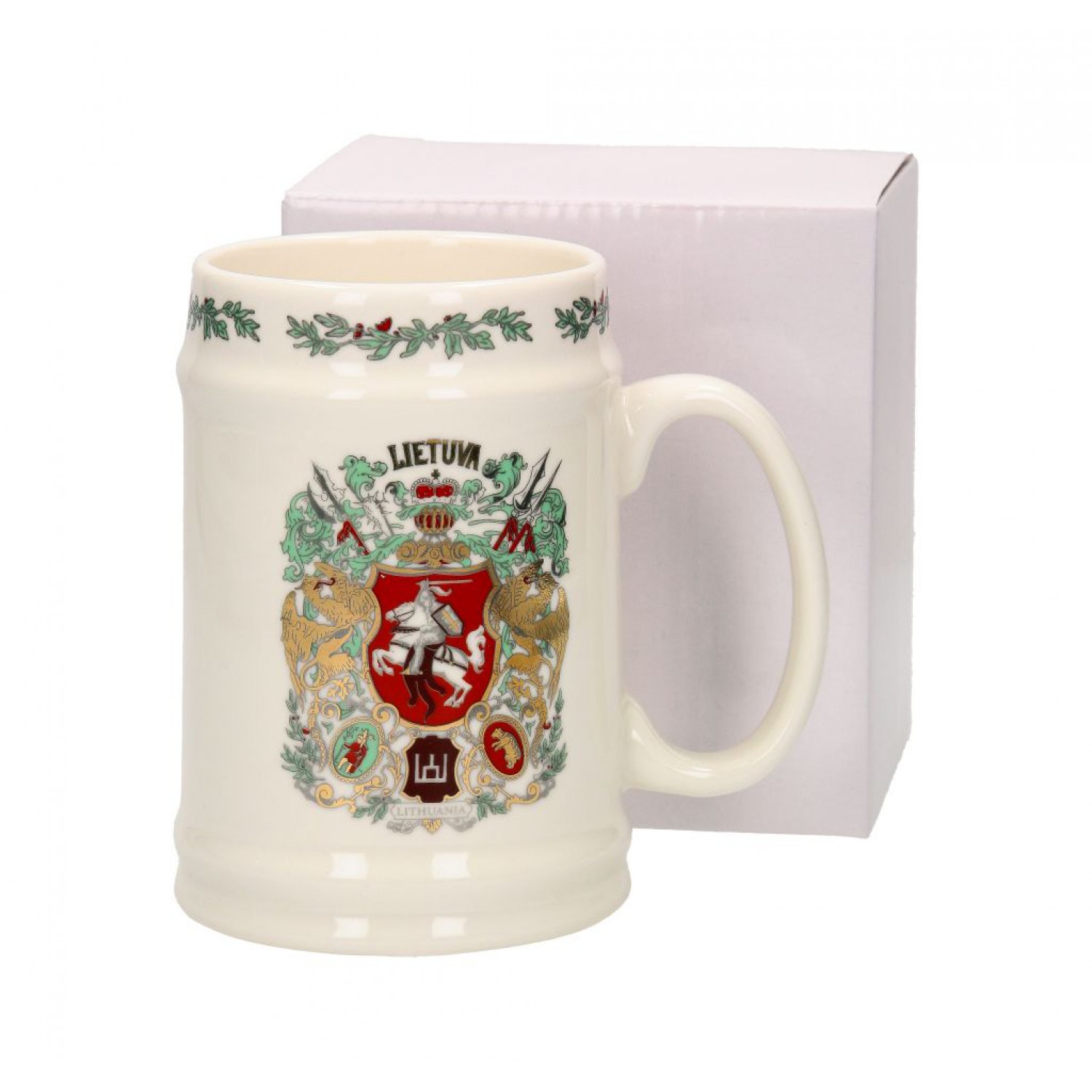 Baltos spalvos porcelianinis bokalas, dekoruotas detaliu Lietuvos herbu su Vyčio simboliu ir užrašu Lietuva. Elegantiškas augalinių motyvų raštas ties krašteliu papildo klasikinį dizainą. Puikiai tinka kaip simbolinis lietuviškas suvenyras ar reprezentacinis indas. Pagamintas iš kokybiško porceliano, tinkamas tiek dekorui, tiek naudojimui.