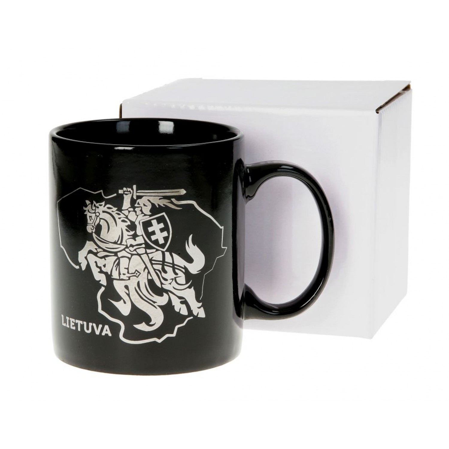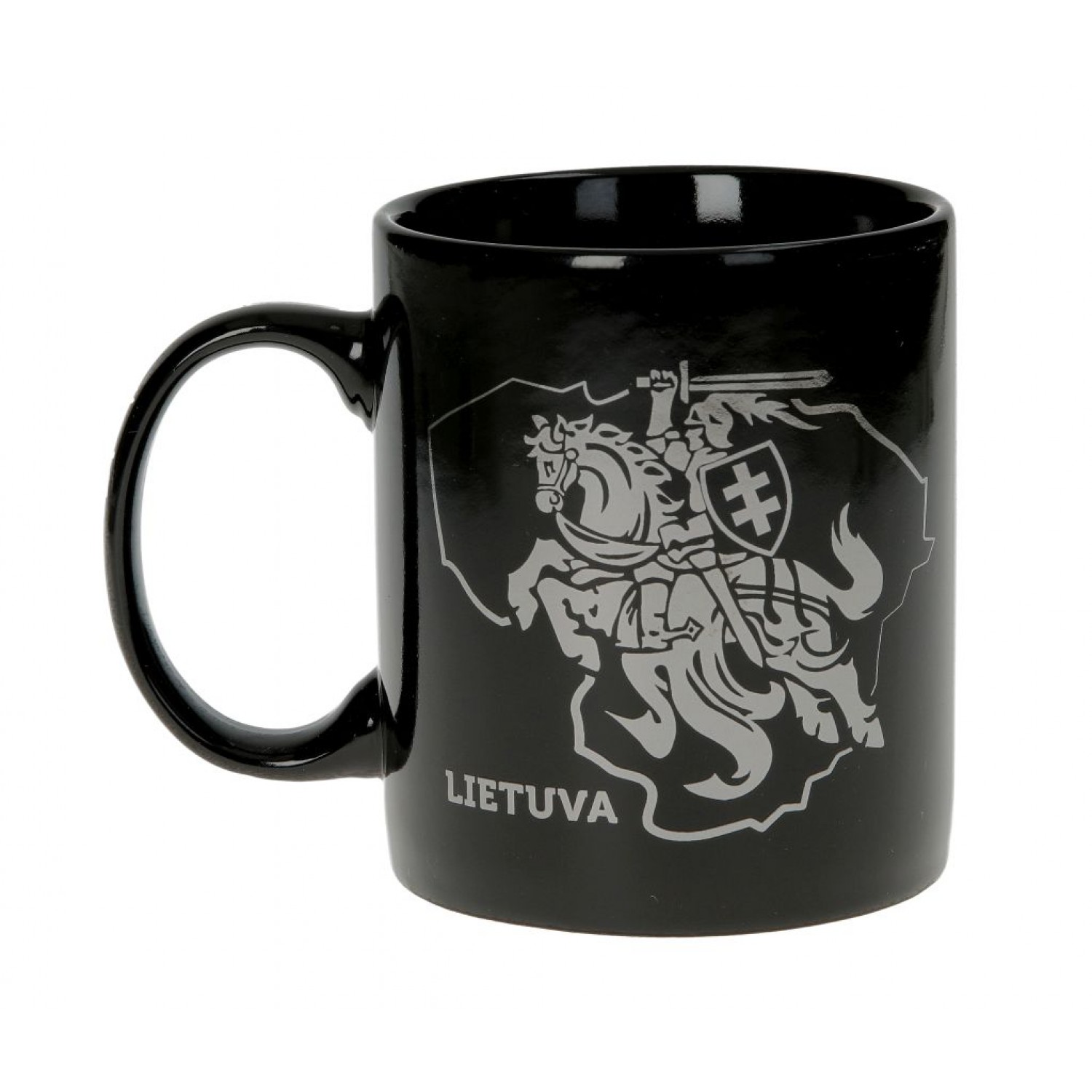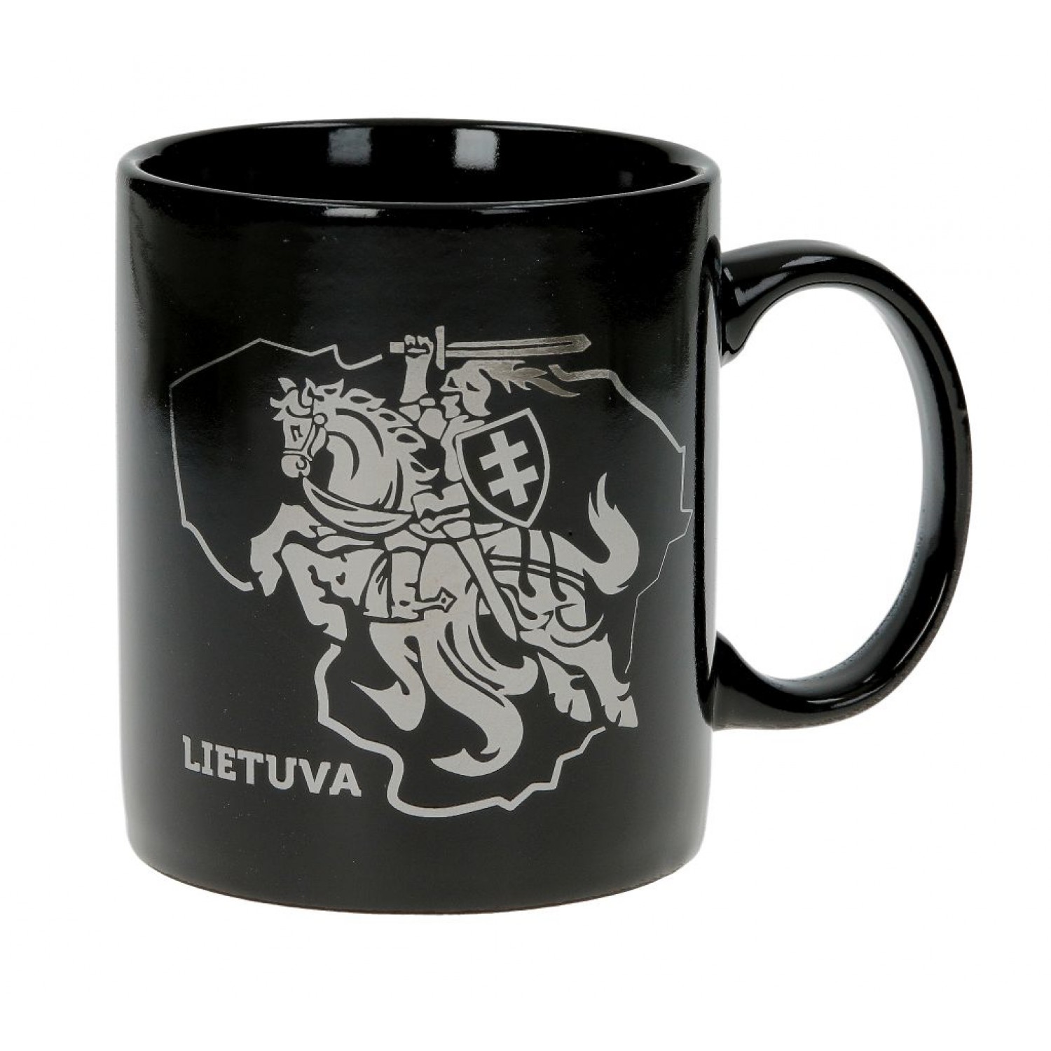 Elegantiškas juodas porcelianinis puodelis su sidabro spalvos Vyčio simboliu ir užrašu Lietuva. Puodelis puikiai tinka kasdieniam naudojimui arba kaip suvenyras.
