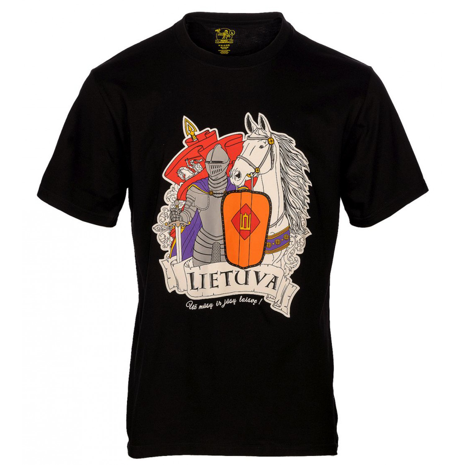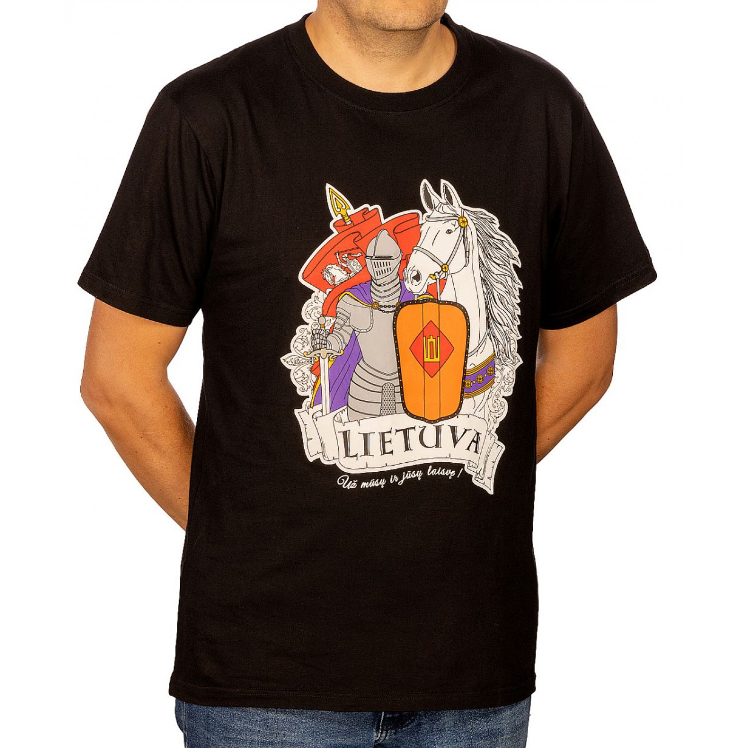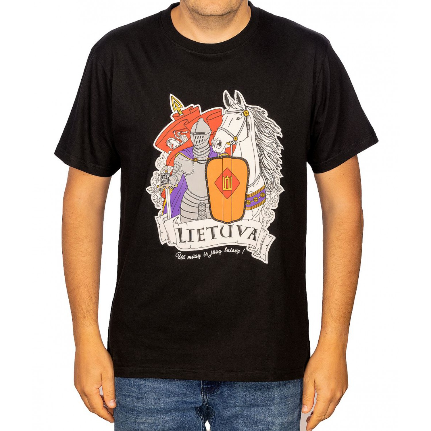 Juodi trumpomis rankovėmis unisex medvilniniai marškinėliai su ryškiu riterio piešiniu ir užrašu Lietuva. Komfortiški ir stilingi marškinėliai, tinkami kasdienai ir patriotiniam stiliui.