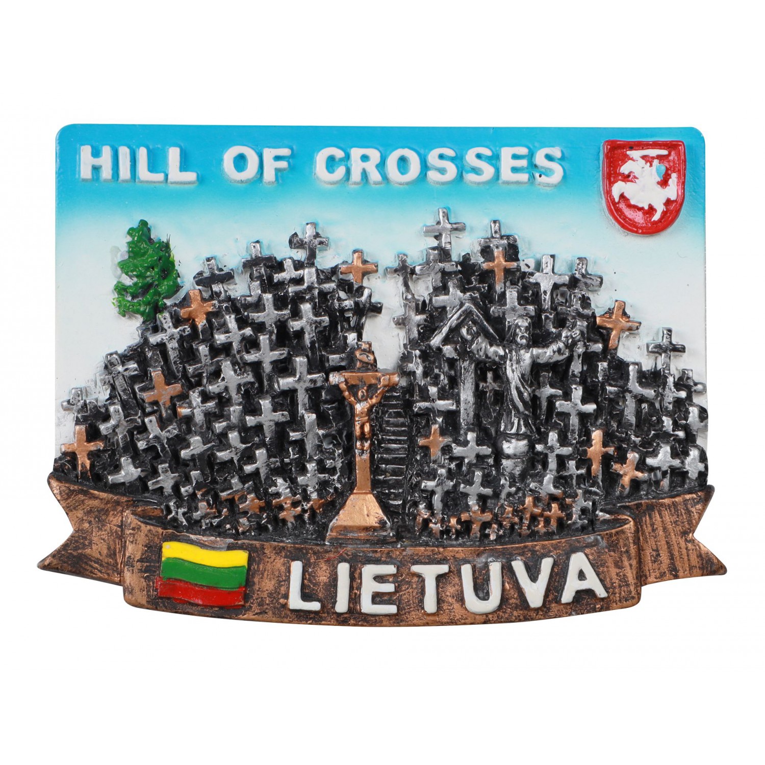 Magnetas Kryžių kalnas pagamintas iš polirezino. Juodos spalvos pagrindas su vario spalvos detalėmis – kryžiais. Viršuje užrašas Hill of Crosses, apačioje – Lietuva su Lietuvos trispalve. Suvenyrinis magnetas skirtas prekybai.