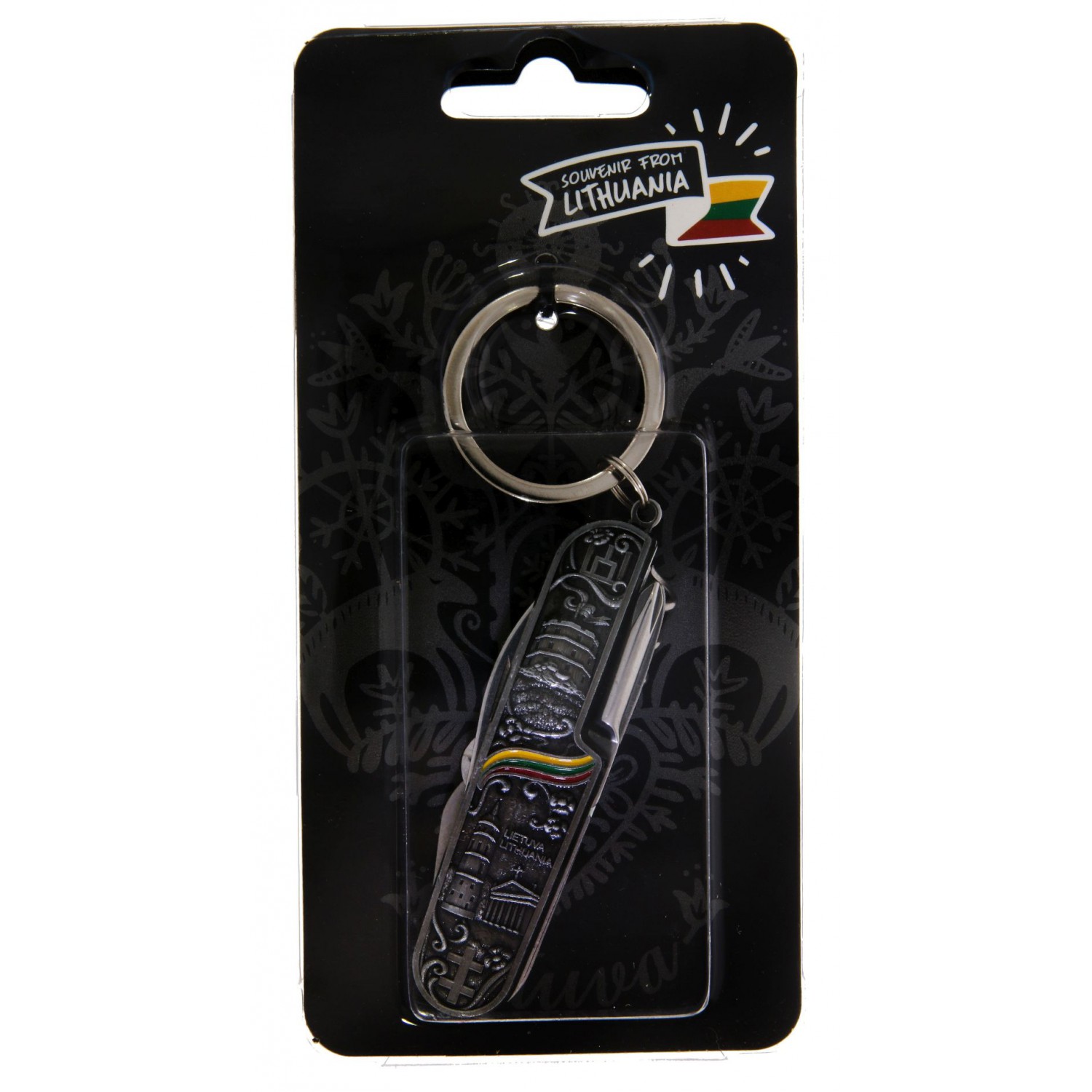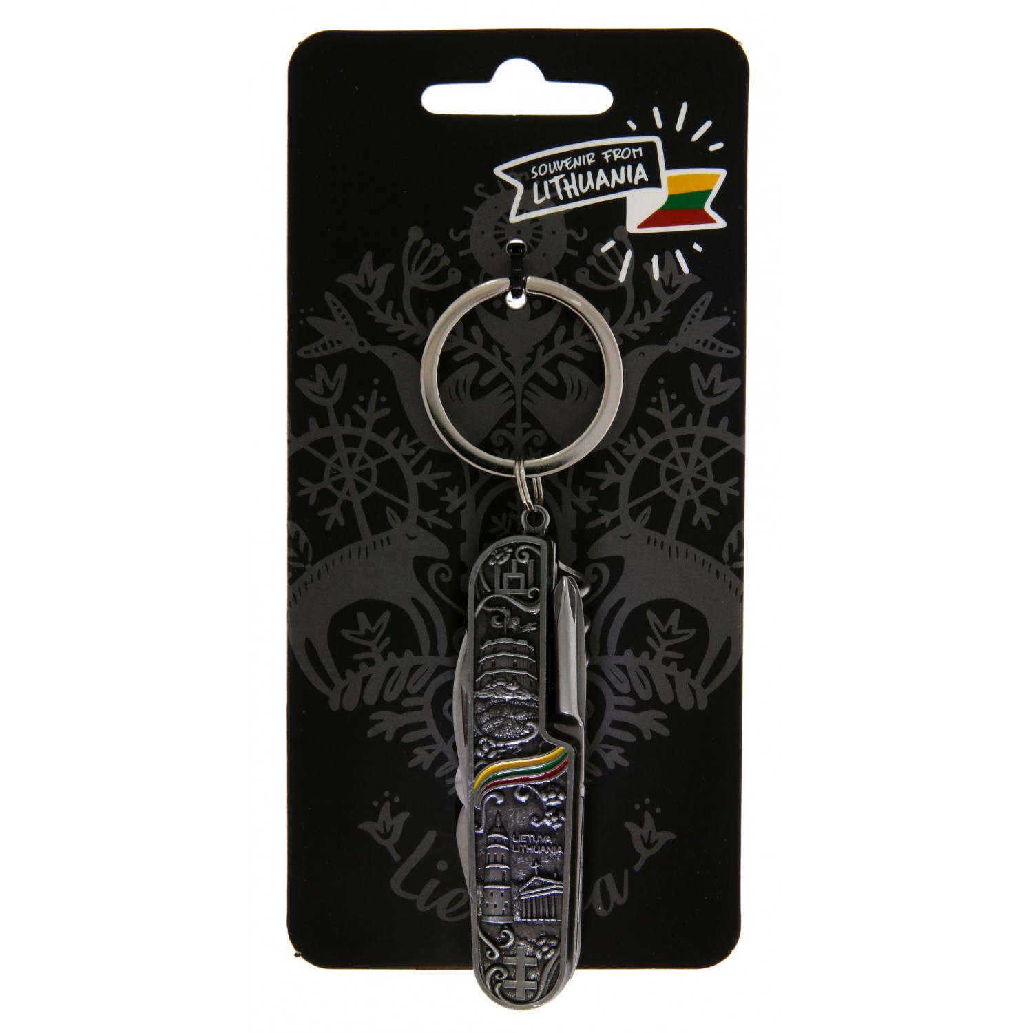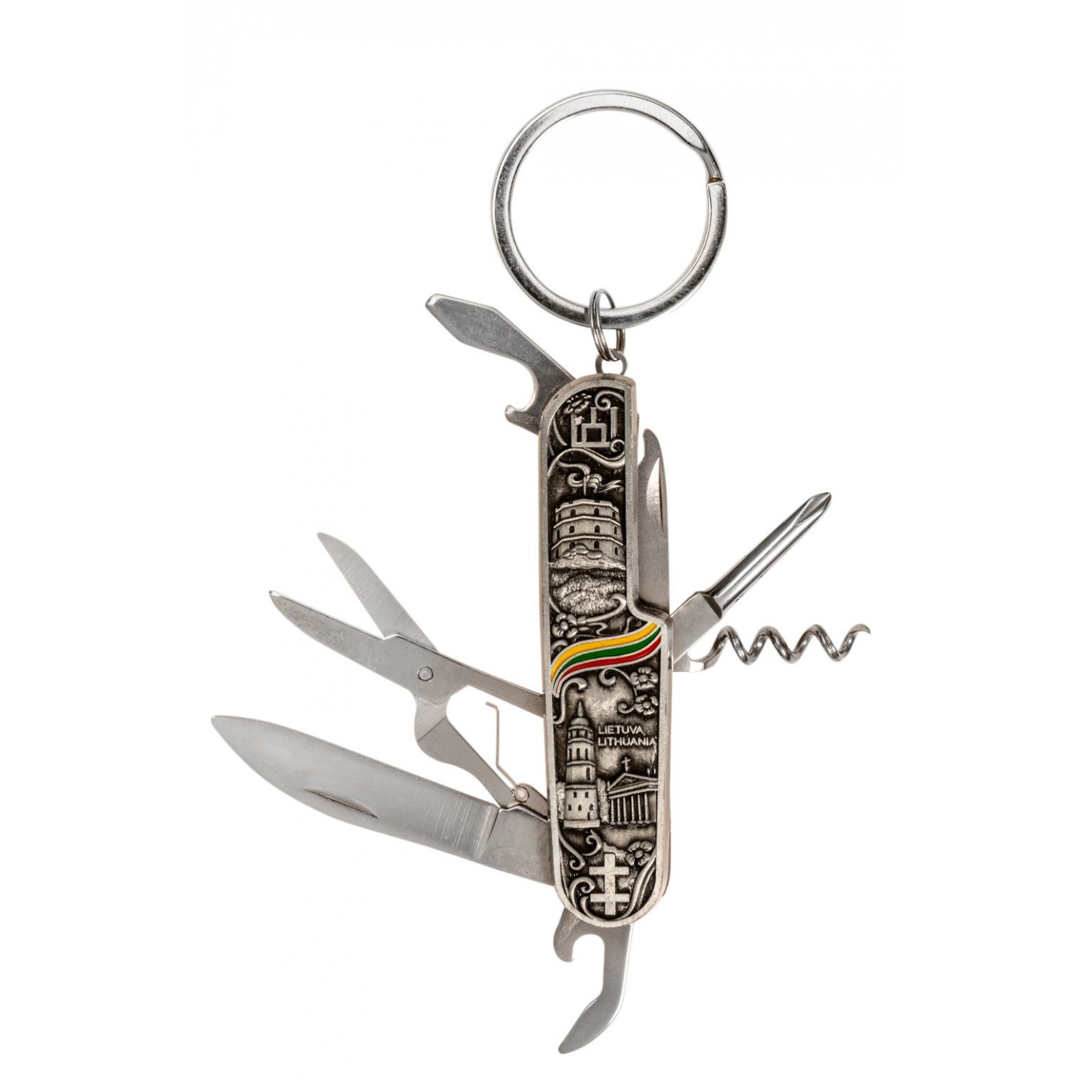 Suvenyrinis kišeninis peiliukas su 7 funkcijomis, dekoruotas iškiliu Vilniaus vaizdų reljefu, užrašu Lietuva – Lithuania ir trispalve. Įrankis turi raktų žiedą, todėl patogus nešiotis. Tvirtas ir praktiškas suvenyras – puikiai tinka tiek kelionėse, tiek kasdieniam naudojimui.
