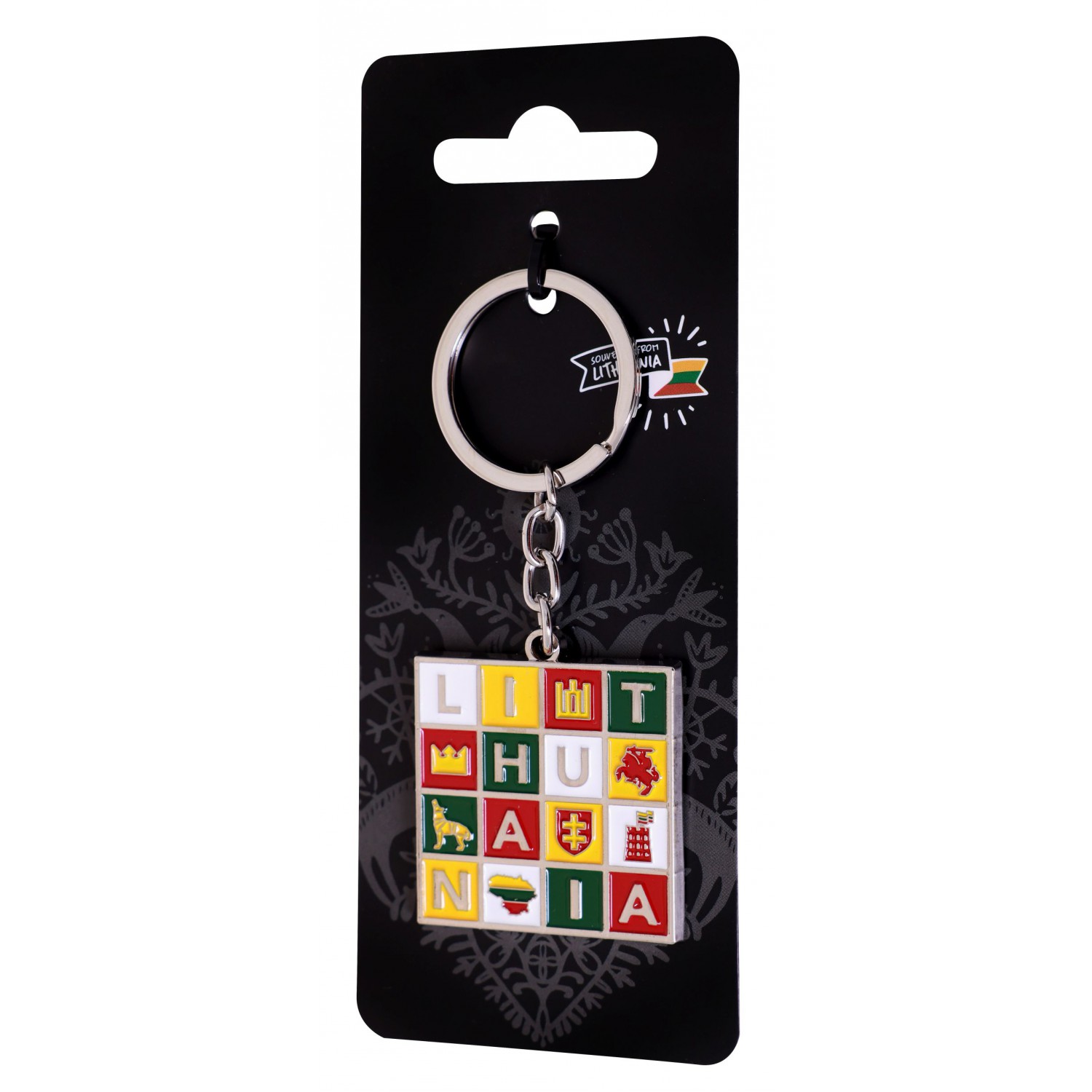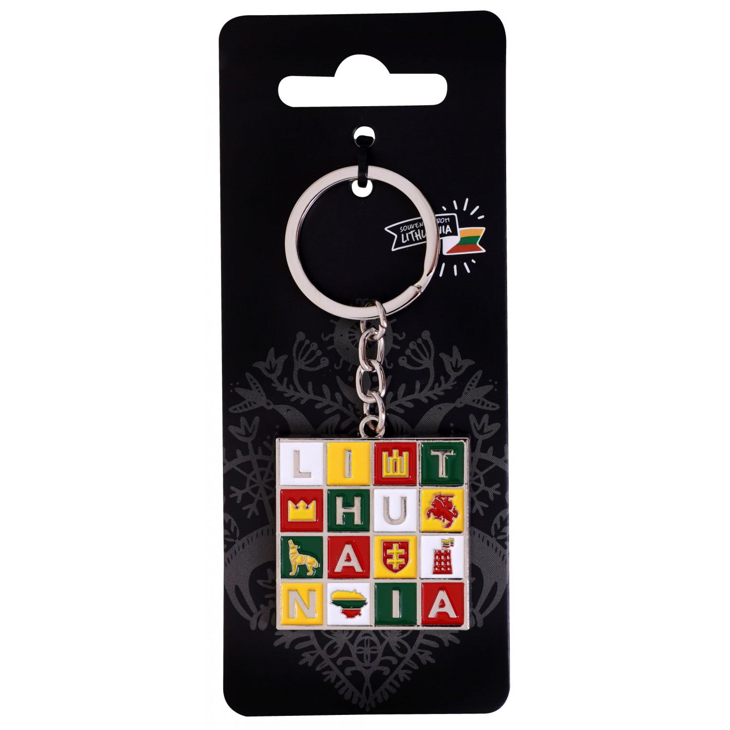 Kvadratinis metalinis raktų pakabukas, padalintas į mažus kvadratėlius, su užrašu Lithuania ir Lietuvos simboliais spalvotame dizaine. Stilingas ir patvarus aksesuaras kasdienai.