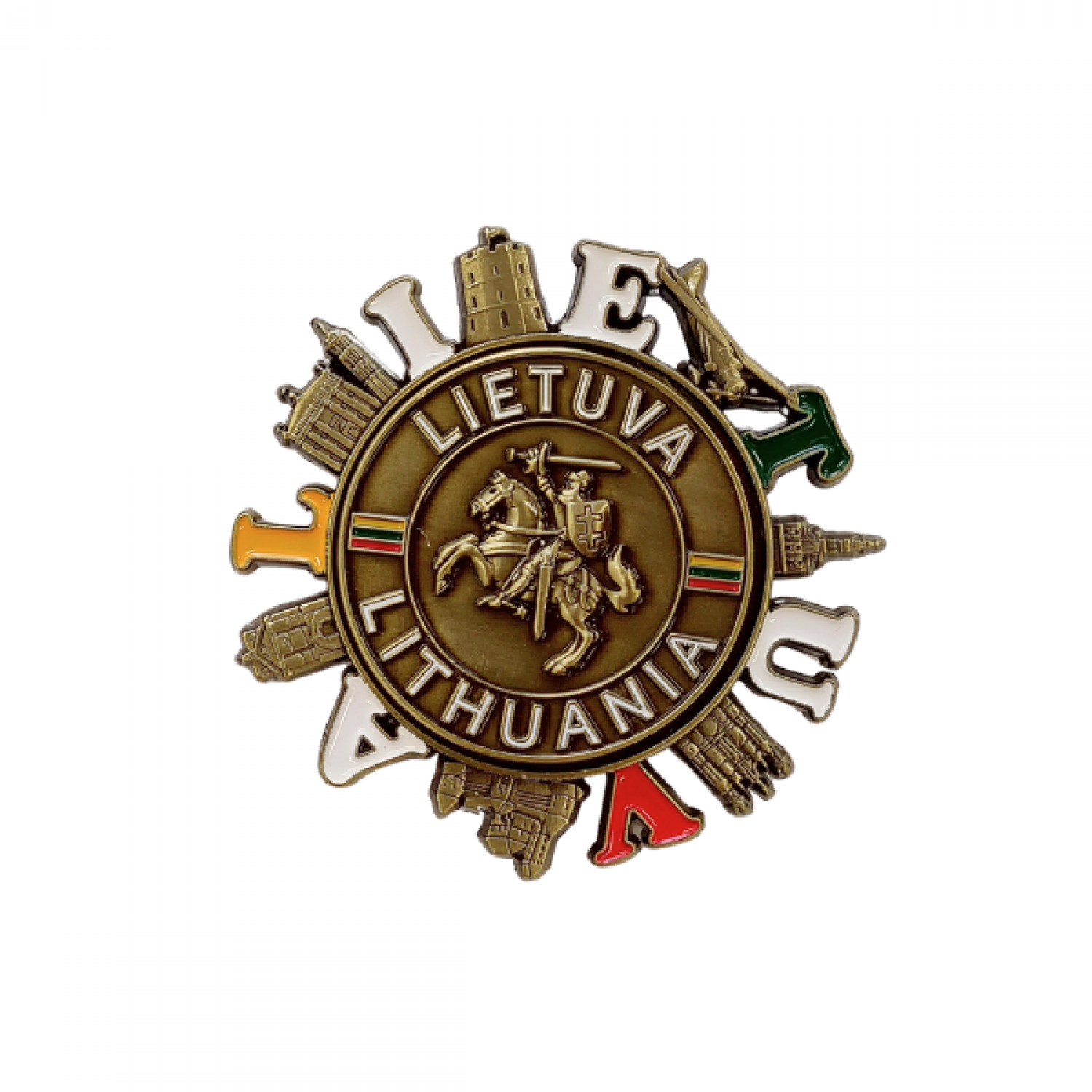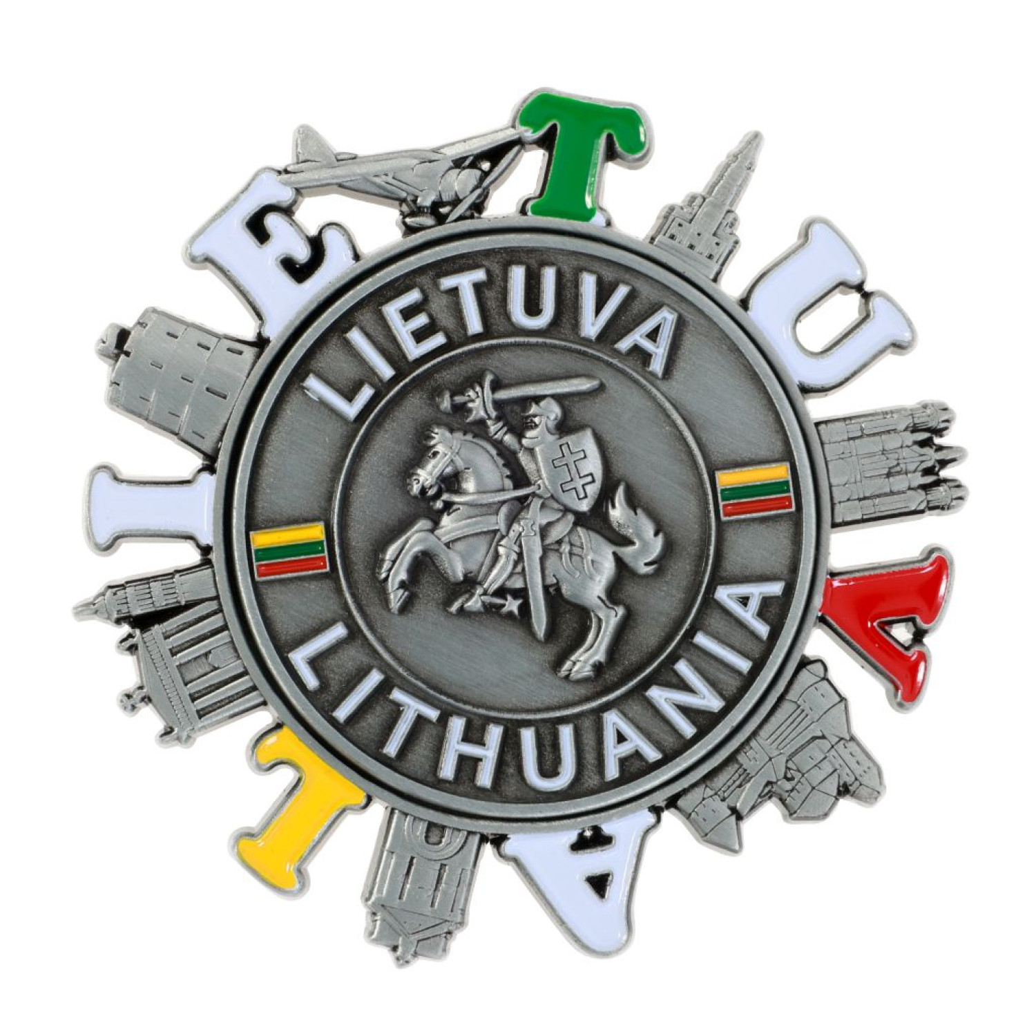 Autentiškas suvenyrinis magnetas su Lietuvos simboliais – puikus pasirinkimas ieškantiems originalaus suvenyro. Centre pavaizduotas Vytis su užrašais Lietuva ir Lithuania, o aplink jį išdėstyti žymiausi šalies objektai bei raidės. Unikali besisukanti detalė aplink centrą suteikia išskirtinumo. Galima rinktis iš sidabro arba bronzos spalvos. Šis magnetas perteikia Lietuvos kultūrinį paveldą ir istoriją, tad puikiai tinka prekybai suvenyrais.