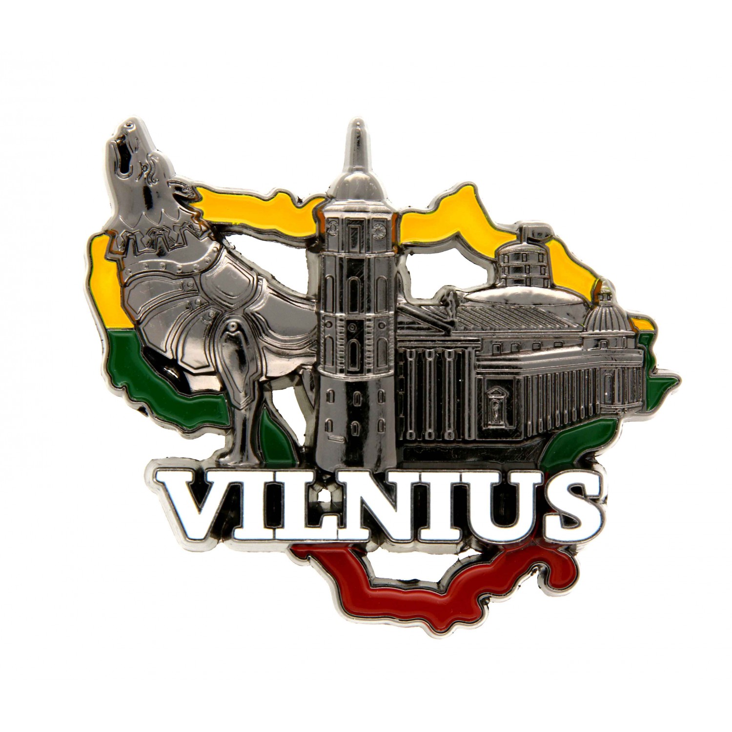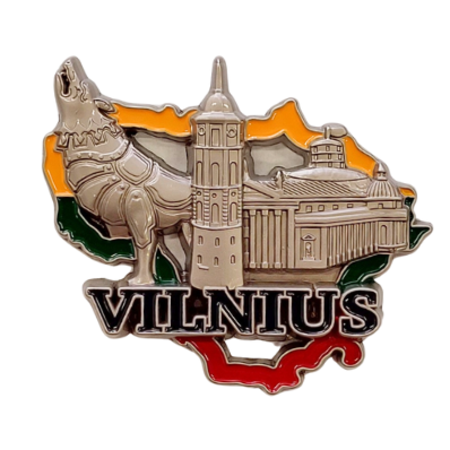 Suvenyrinis magnetas su Geležiniu Vilku, Vilniaus katedra ir Lietuvos kontūru, dekoruotu trispalvės spalvomis. Dizainas atspindi legendinę Vilniaus kilmę bei miesto istorinį paveldą. Galimi spalvų pasirinkimai – juoda arba sidabro.
