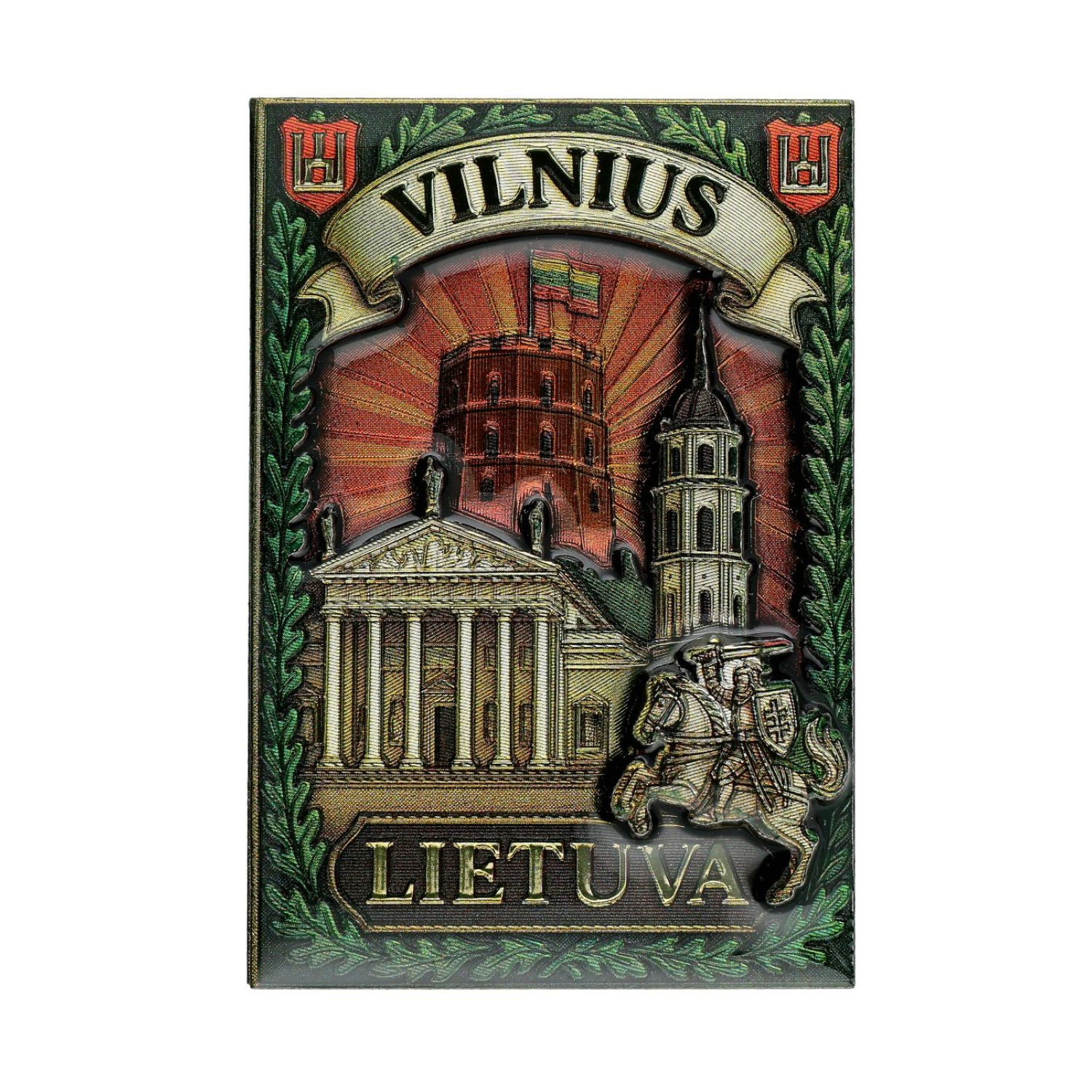Magnetas Vilnius su Gedimino pilies bokštu, katedra ir vyčiu. Magnetas tarsi įrėmintas su ąžuolo lapų rašto krašteliu.