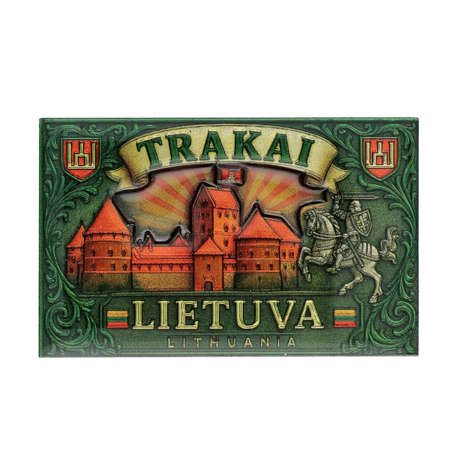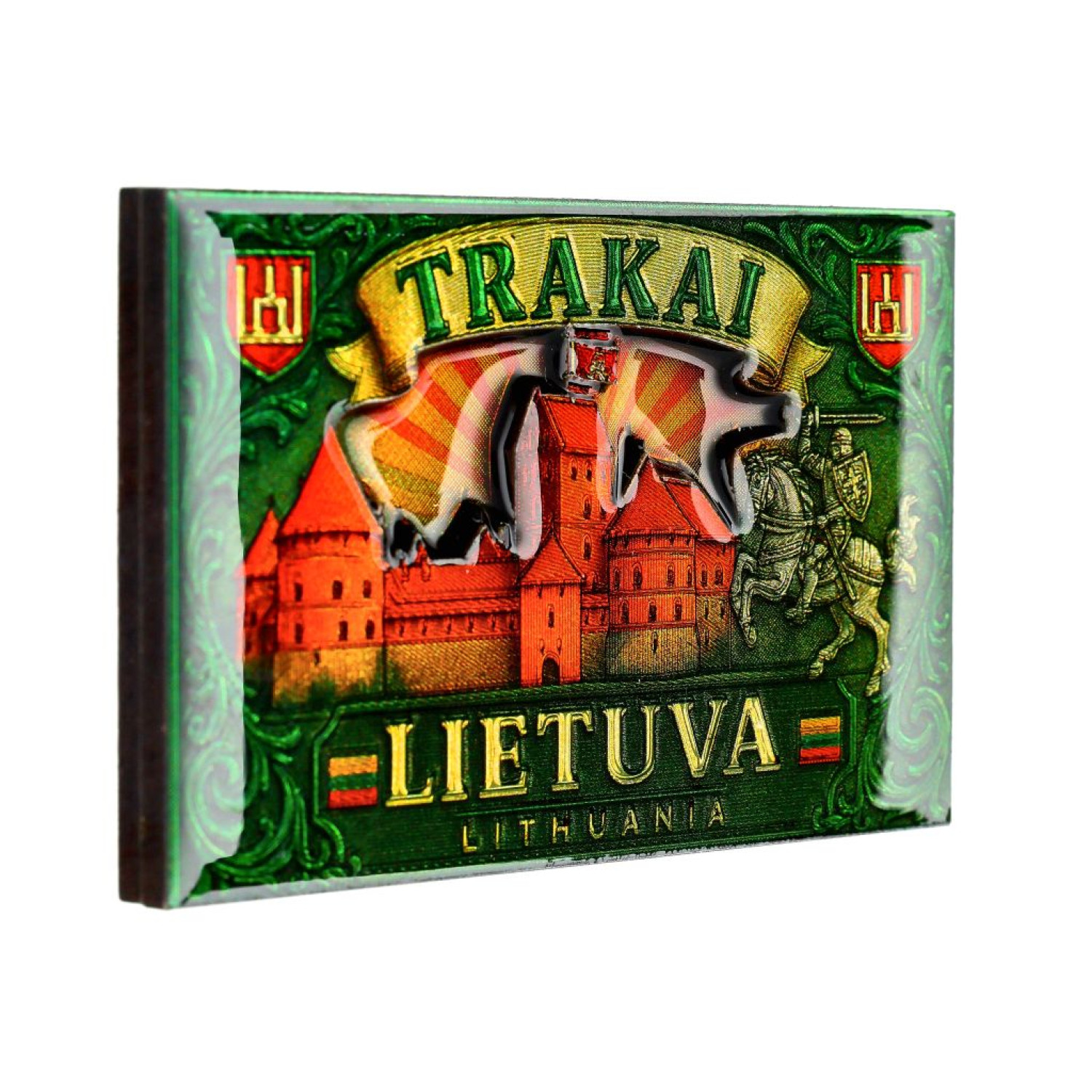 Magnetas Trakai su pilimi ir vyčiu. Dekoruotas žaliu krašteliu bei Gediminaičių stulpai.