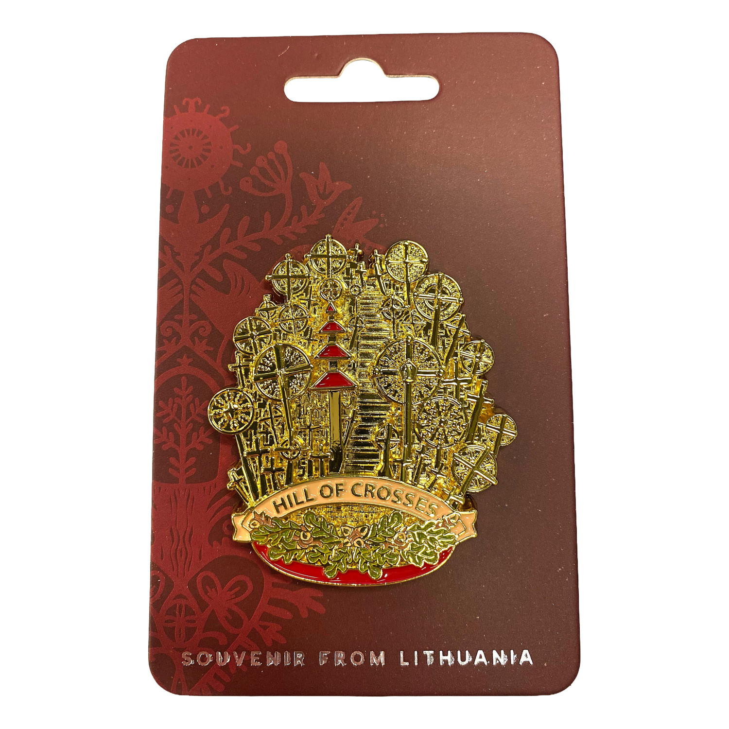 Suvenyrinis metalinis magnetas Kryžių kalnas, dekoruotas ąžuolo lapais ir Kryžių kalno atvaizdu. Magnete – užrašas anglų kalba Hill of Crosses.