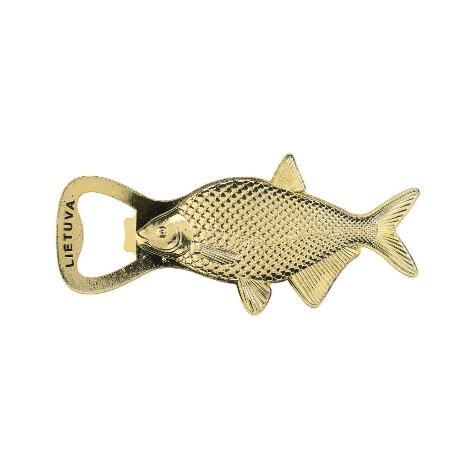 Suvenyrinis metalinis magnetas-atidarytuvas, žuvies formos, aukso spalvos, su užrašu Lietuva. Originalus ir praktiškas suvenyras, puikiai tinkantis prekybai suvenyrų parduotuvėse ir turistinėse vietose.