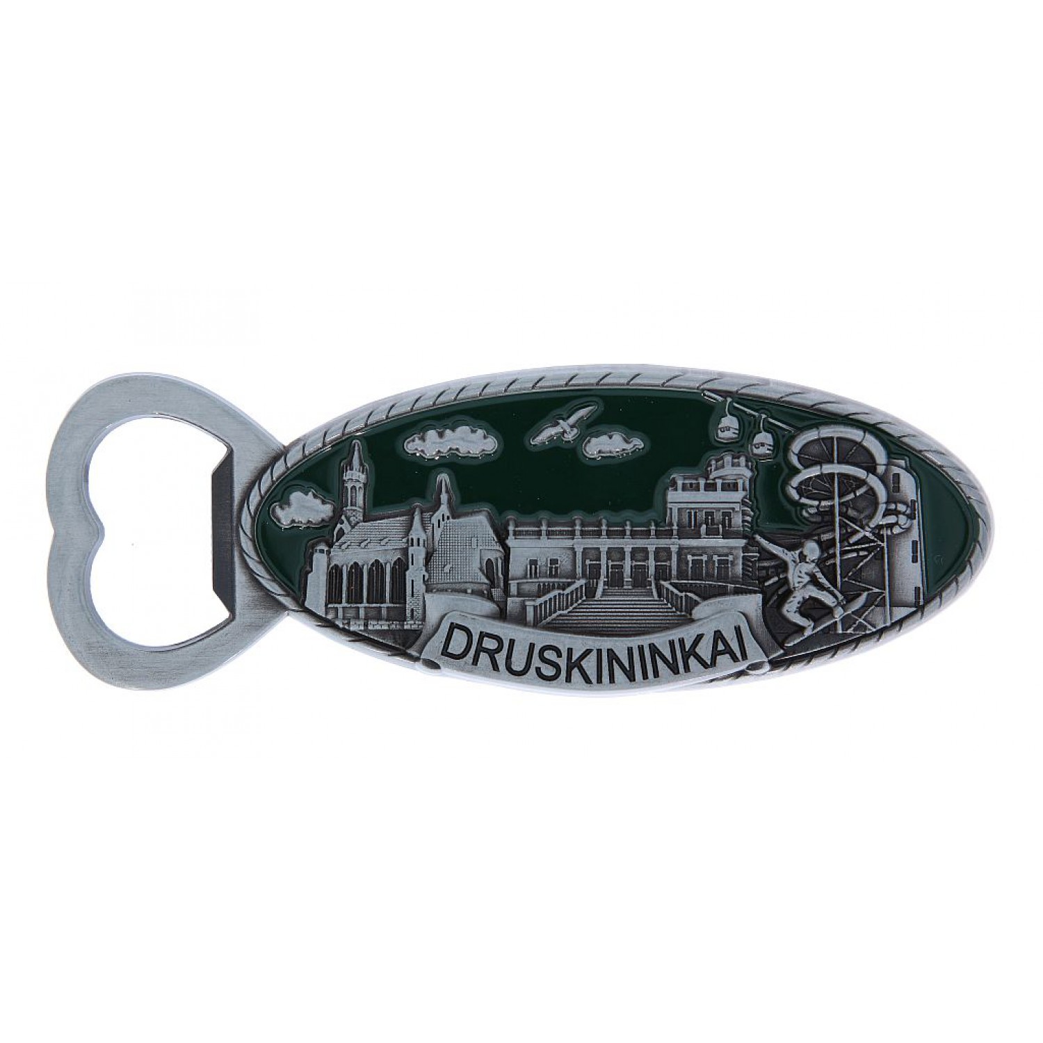 Metalinis, ovalo formos, suvenyrinis magnetas atidarytuvas, su tamsiai žalios spalvos fonu ir Druskininkų lankytinų vietų vaizdu. Patvarus, praktiškas ir puikiai tinkantis prekybai.