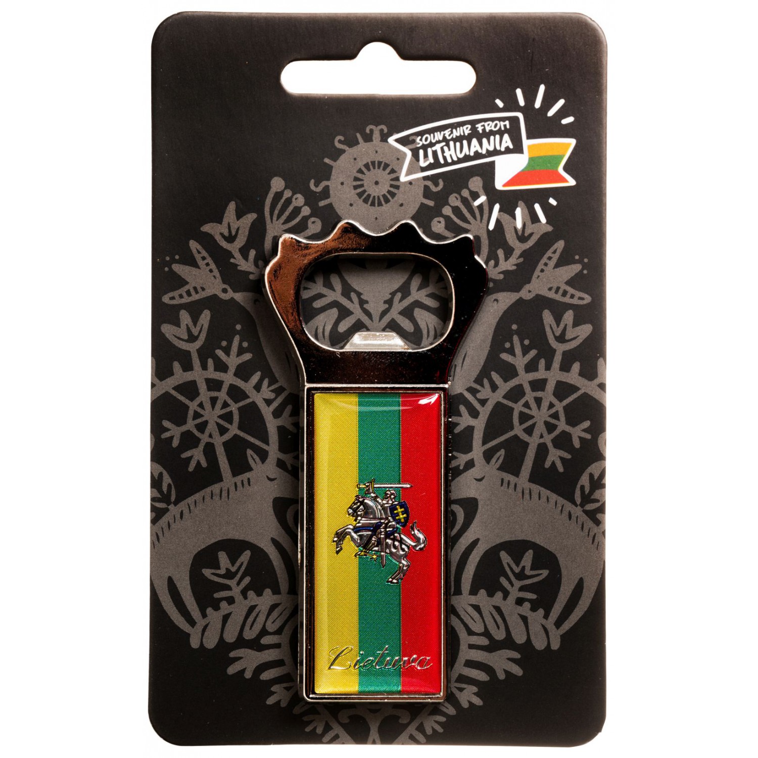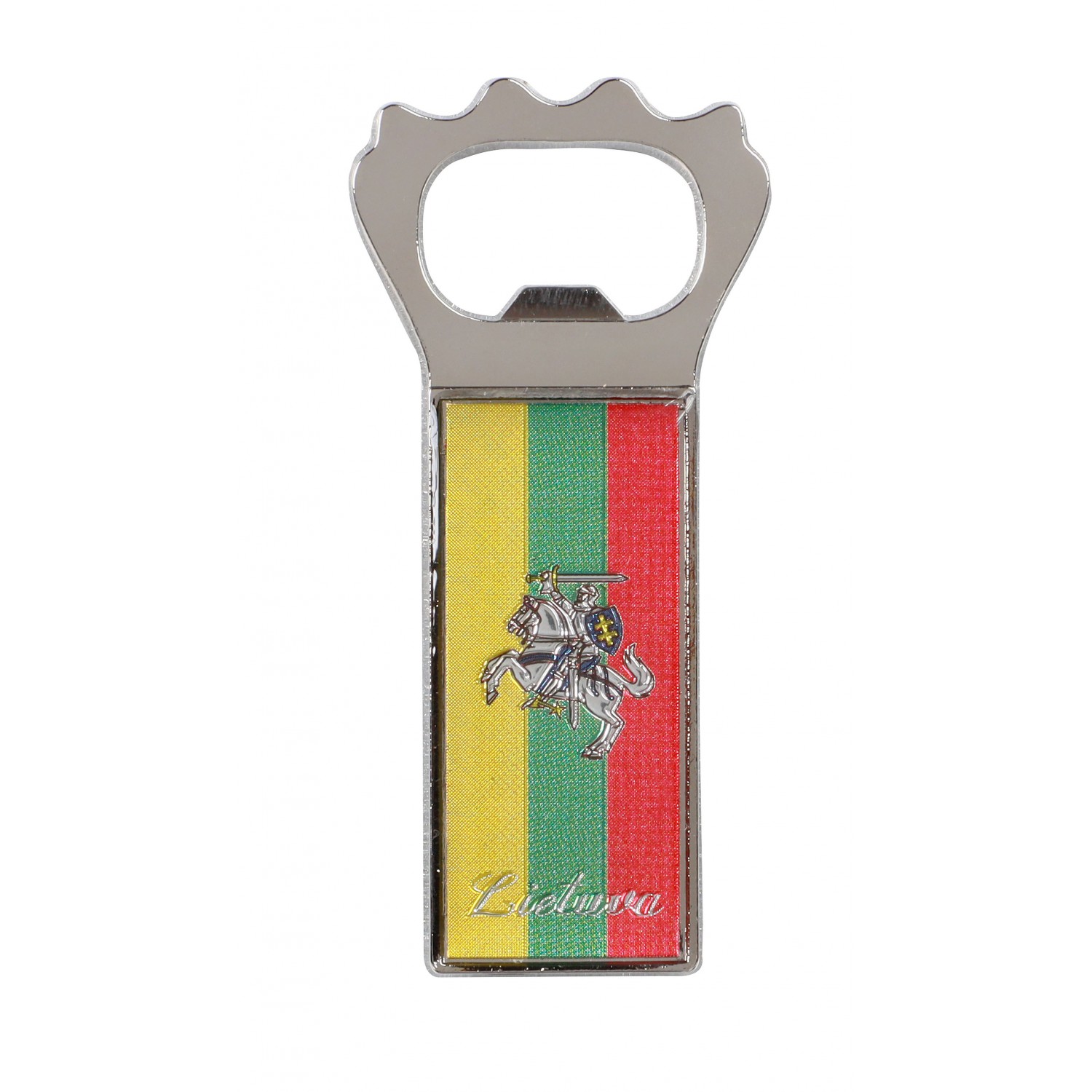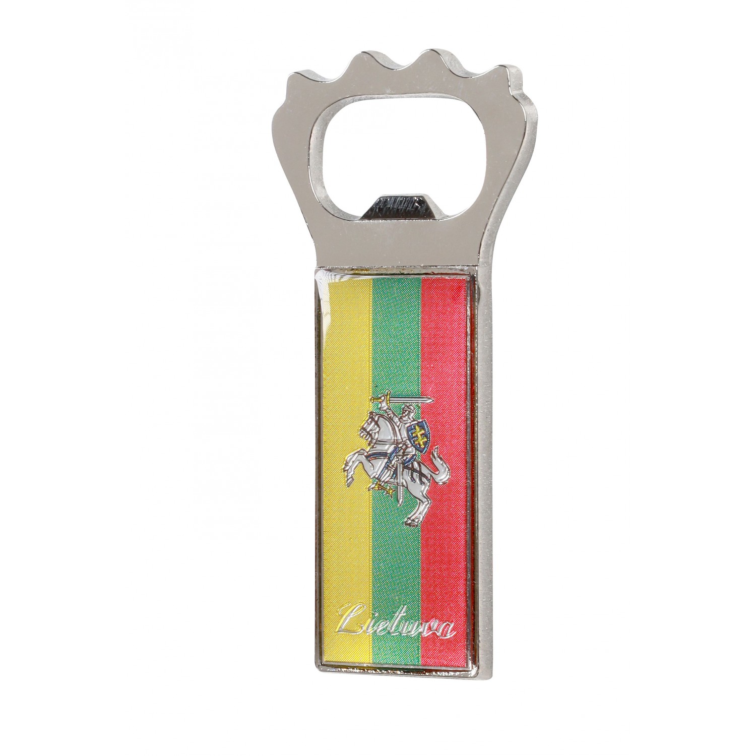 Magnetas atidarytuvas Lietuva ir Vytis trispalvės fone