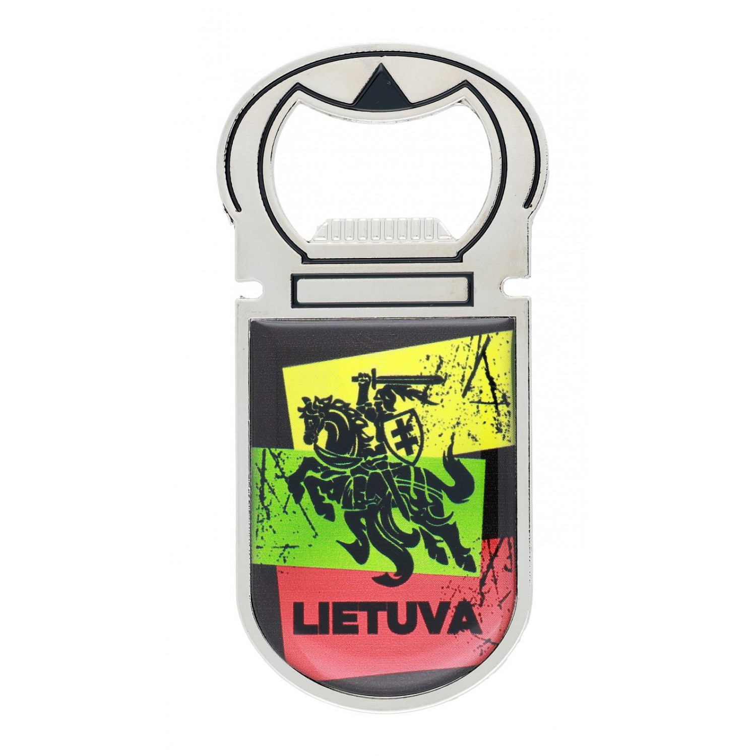 Suvenyrinis metalinis magnetas atidarytuvas su Vyčiu Lietuvos trispalvės fone ir užrašu Lietuva. Pagamintas iš metalo, padengtas skaidria epoksidine derva, kuri apsaugo paviršių ir suteikia estetinį blizgesį. Magnetas tvirtai laikosi ant metalinių paviršių.