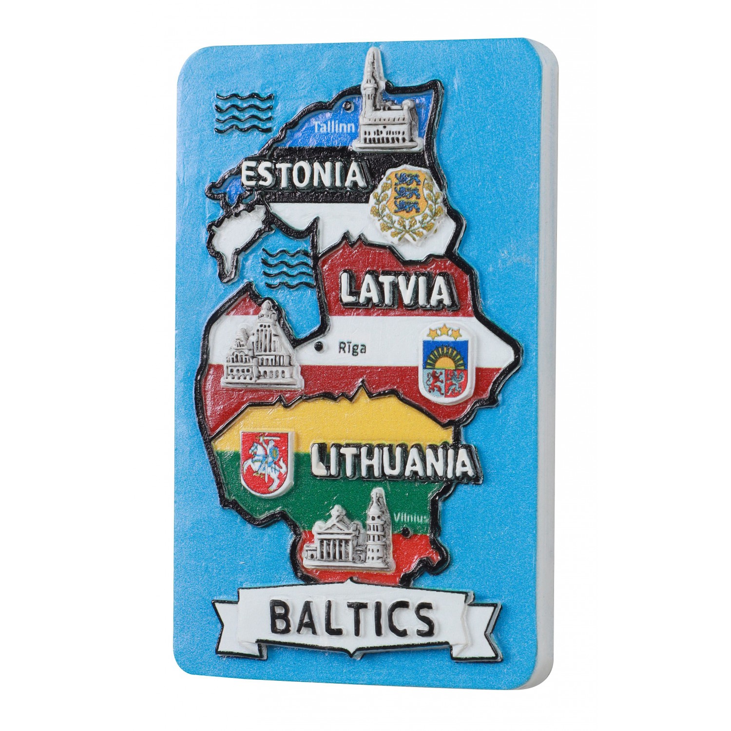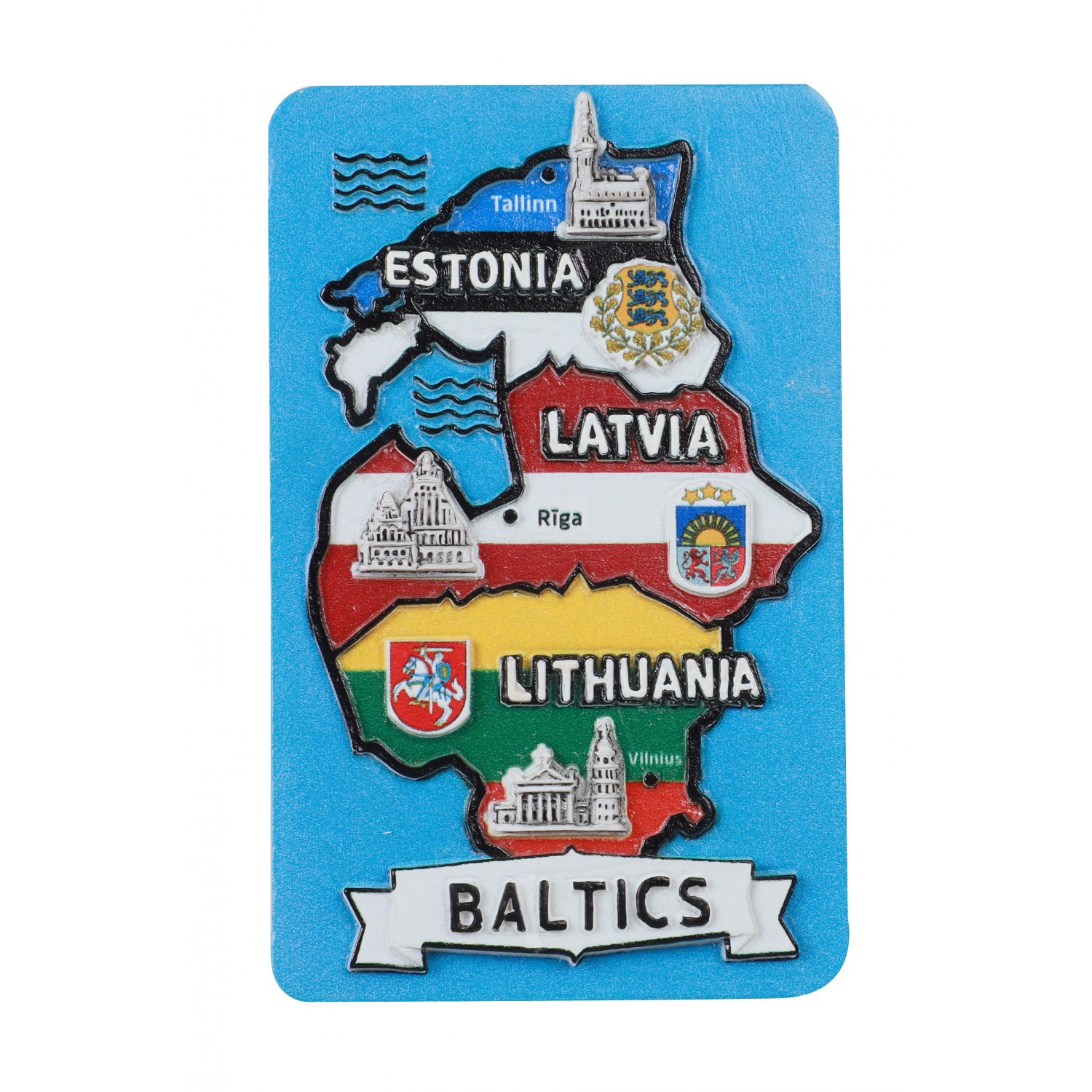 Spalvingas polirezino magnetas vaizduoja trijų Baltijos šalių – Estijos, Latvijos ir Lietuvos – žemėlapį su kontūrais, vėliavomis, miestais ir architektūriniais simboliais. Kiekviena šalis pažymėta pagrindiniu miestu – Talinu, Ryga ir Vilniumi – bei simboline architektūra. Magneto fone – mėlyna jūra ir dekoratyvinis užrašas Baltics. Tai išskirtinis suvenyras, atspindintis Baltijos regiono vienybę ir kultūrinę įvairovę.