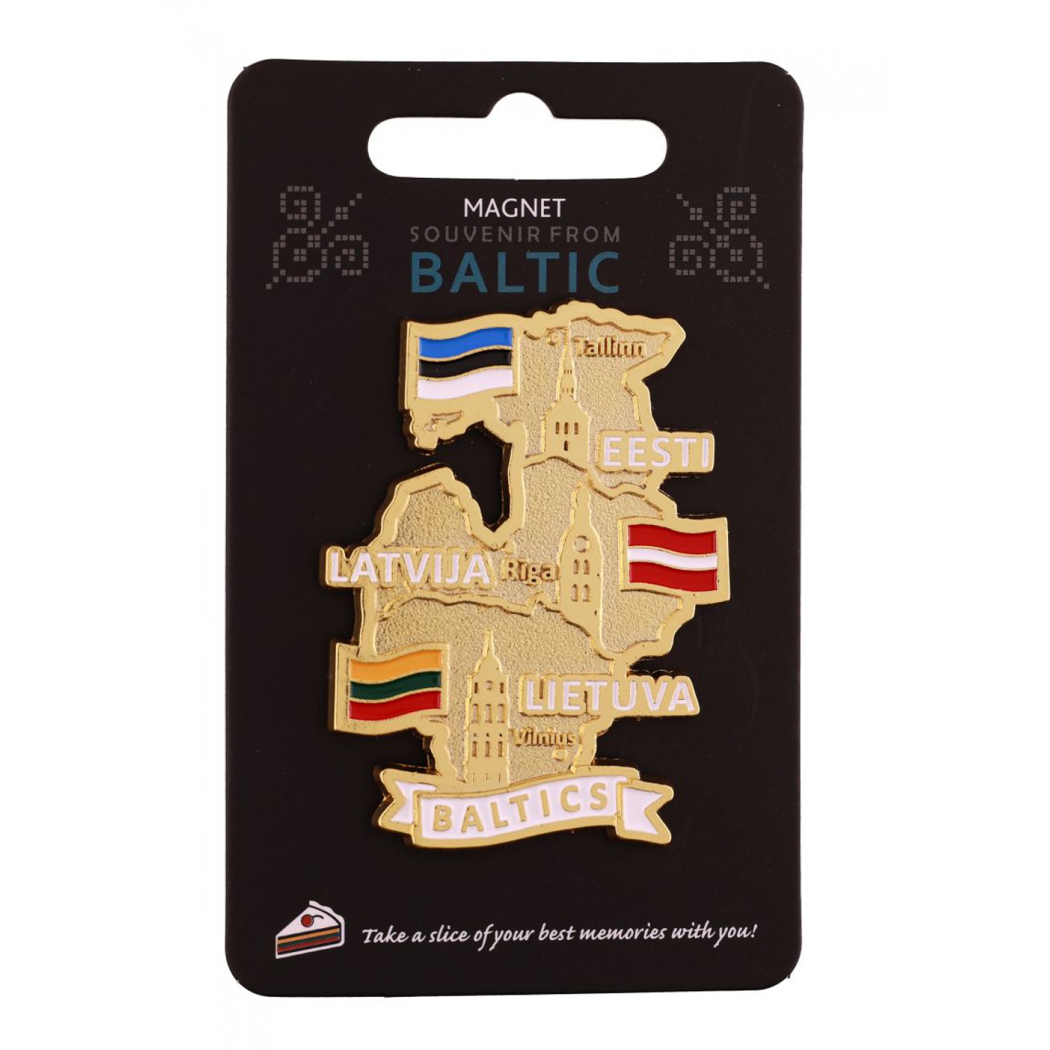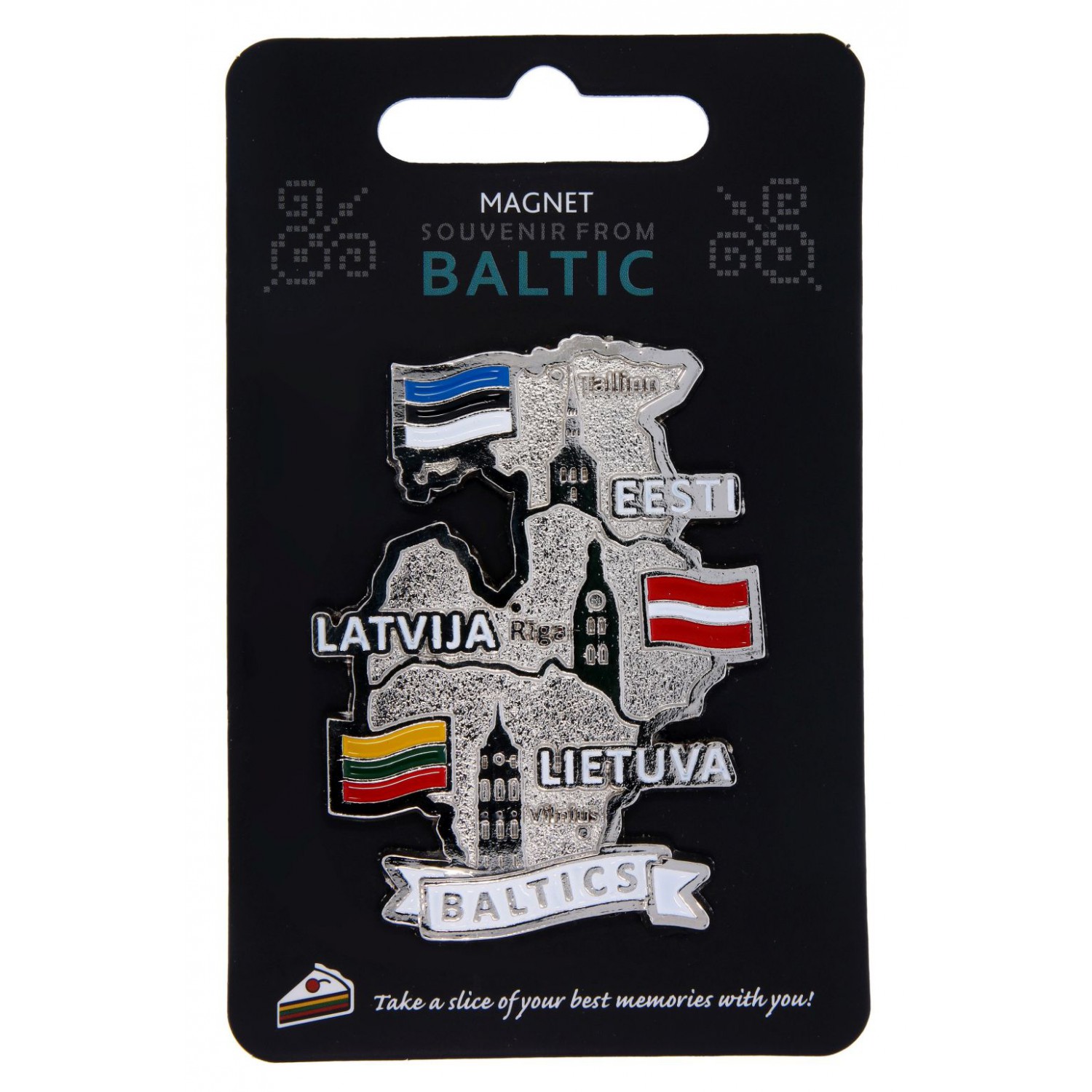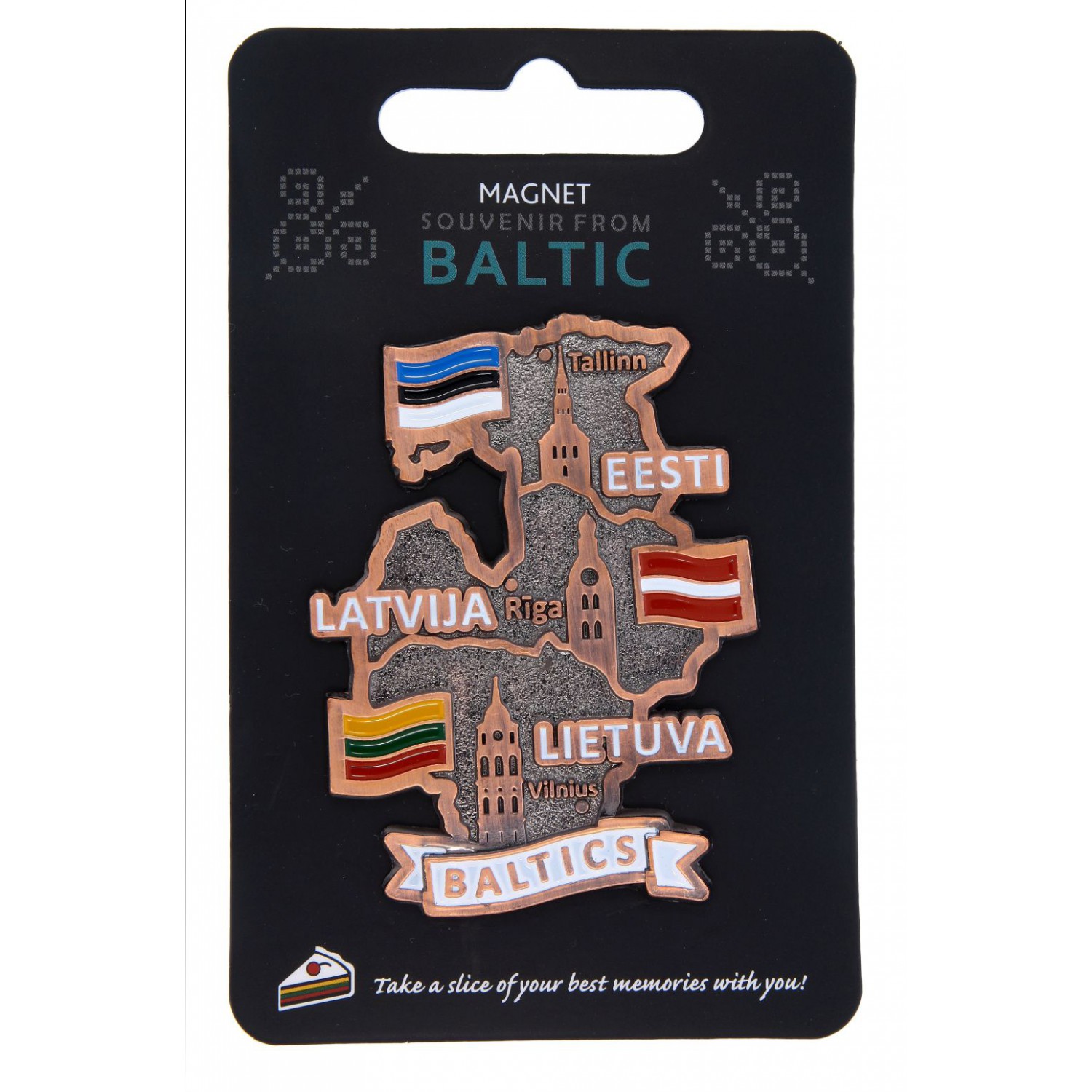 Stilingas suvenyrinis magnetas su Baltijos šalių kontūrais – Lietuva, Latvija, Estija, papuoštas užrašu Baltics. Pagamintas iš metalo, puikiai atspindi Baltijos valstybes. Galimi spalvų variantai – vario, sidabro arba aukso.