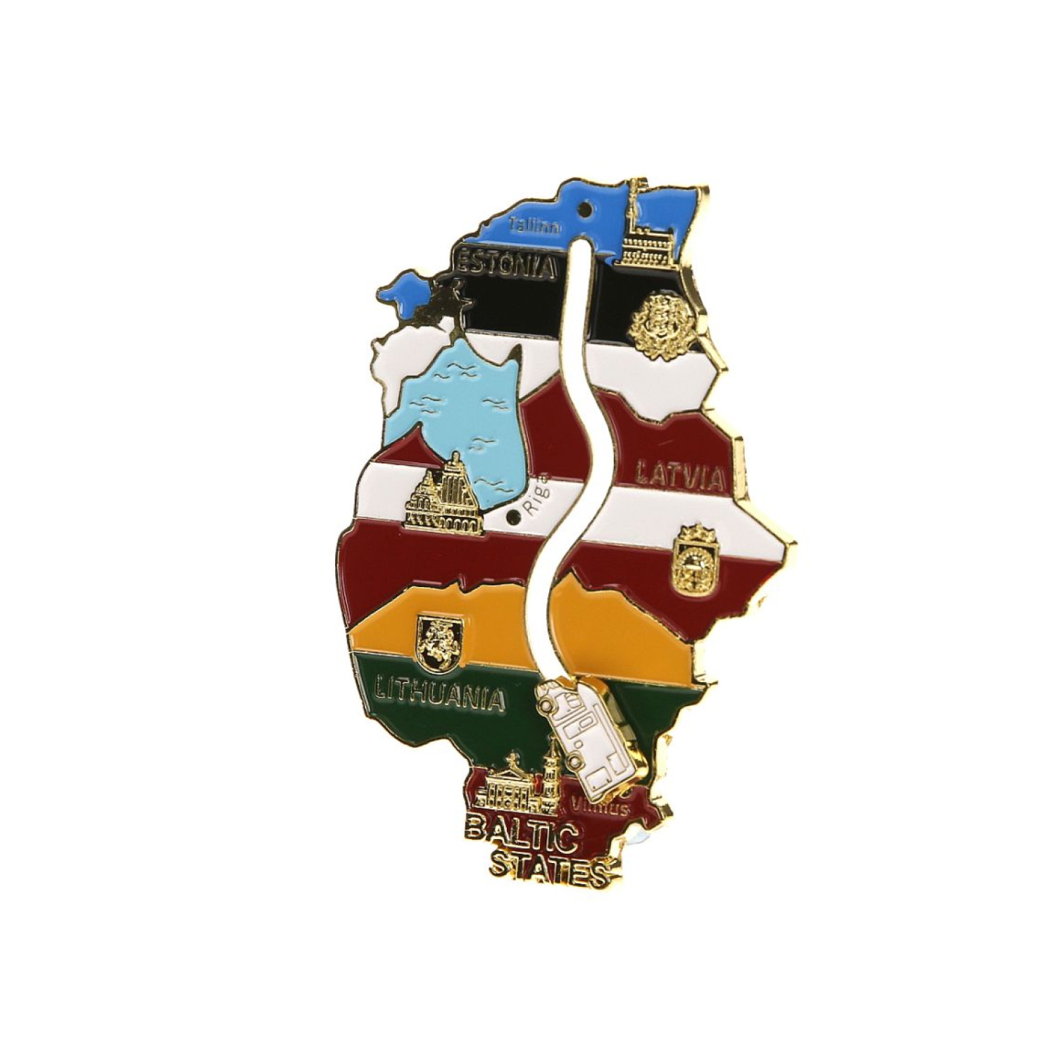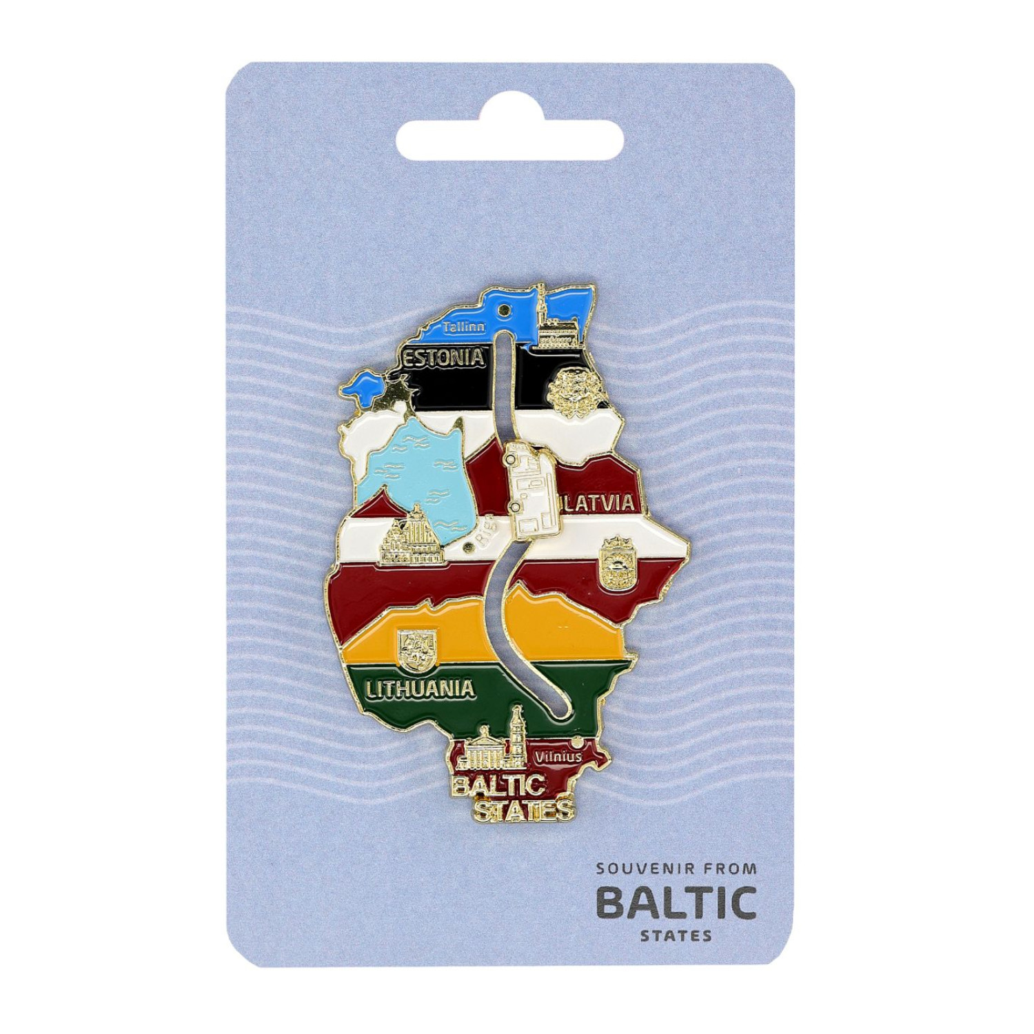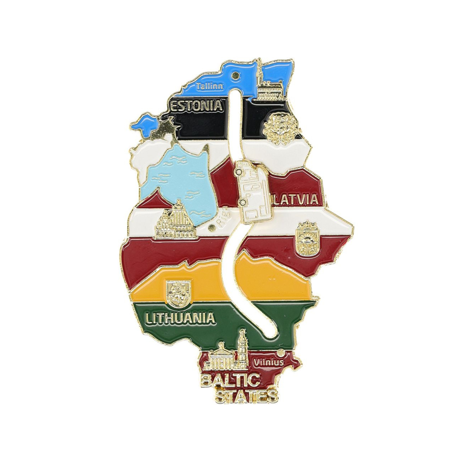 Spalvingas suvenyrinis magnetas, vaizduojantis Baltijos šalis – Lietuvą, Latviją ir Estiją. Žemėlapyje pavaizduotos nacionalinės vėliavos, sostinės (Vilnius, Ryga, Talinas) ir žymūs architektūriniai simboliai. Magneto centre – žaismingas judantis automobilis, kuris keliauja per visas tris sostines. Tinka prekybai suvenyrais.