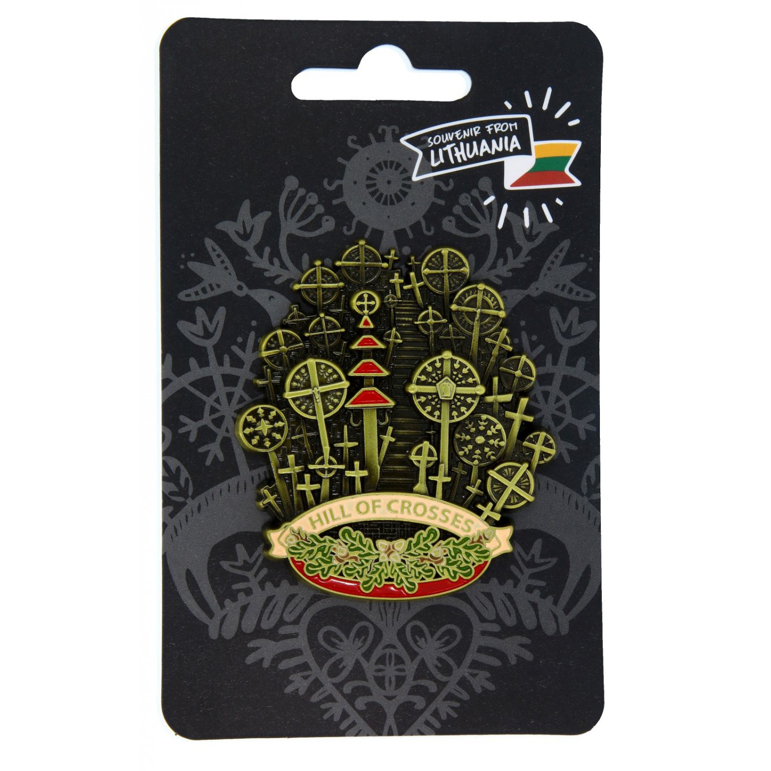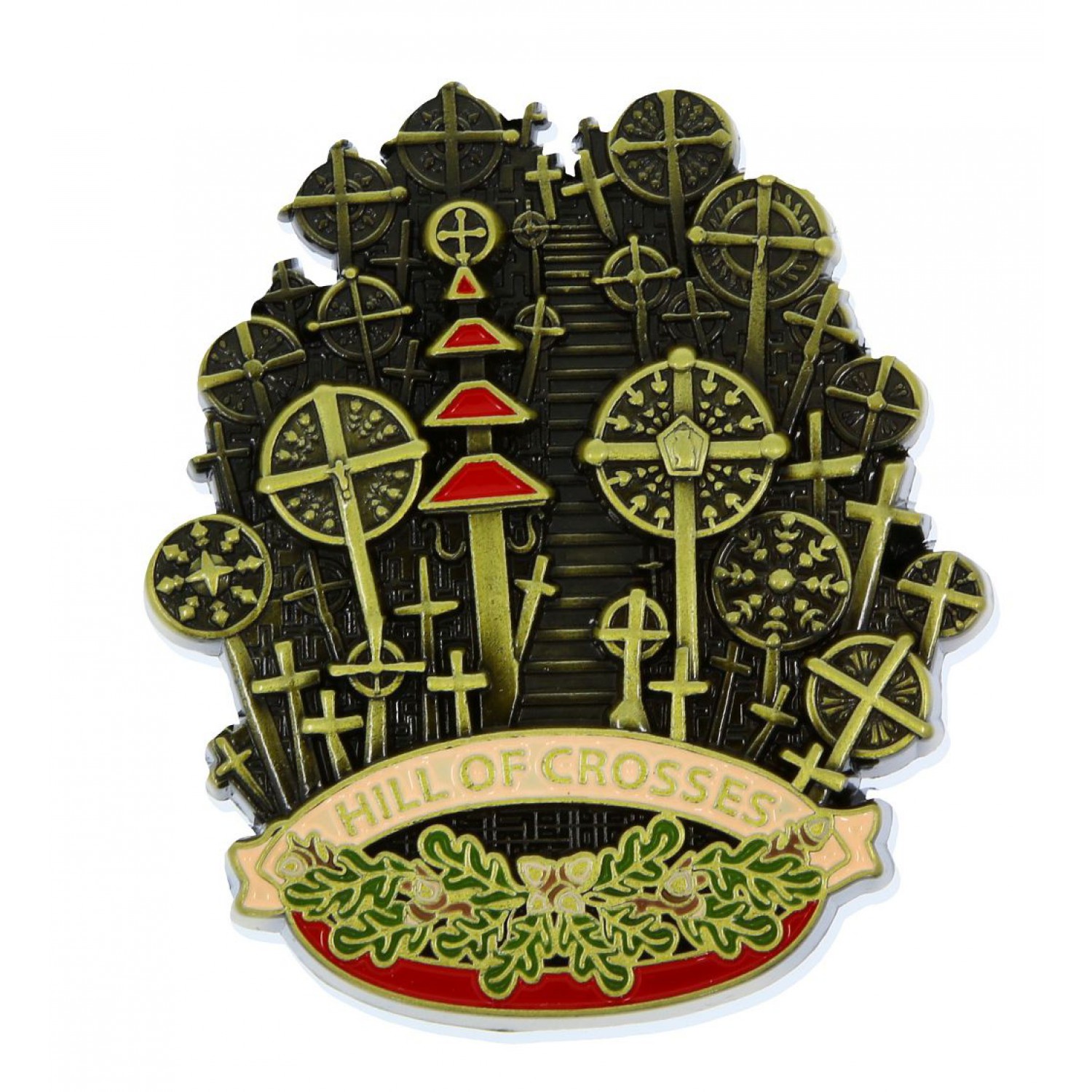 Suvenyrinis metalinis magnetas Kryžių kalnas, dekoruotas ąžuolo lapais ir Kryžių kalno atvaizdu. Magnete – užrašas anglų kalba Hill of Crosses.