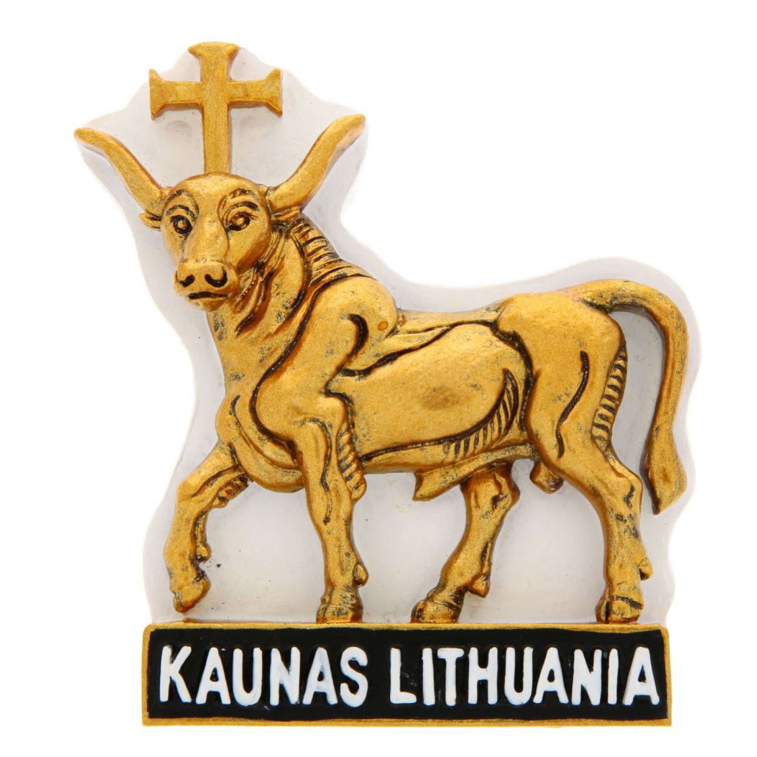 Auksinės spalvos suvenyrinis šaldytuvo magnetas su Kauno miesto herbu – Tauru ir kryžiumi tarp ragų. Ant magneto matomas užrašas Kaunas Lithuania, žymintis miesto kilmę. Magnetas pagamintas iš patvarios polirezino keramikos.