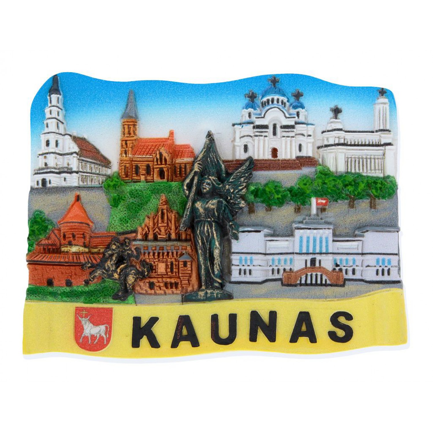 Suvenyrinis magnetukas Kaunas, su įžymiais Kauno objektais. Pagamintas iš polirezino keramikos. Vaizduoja Soborą, Kauno pilį, Prisikėlimo bažnyčią, Karo muziejų, Perkūno namus, Vytauto Didžiojo bažnyčią, Laisvės karių ir Laisvės paminklą.