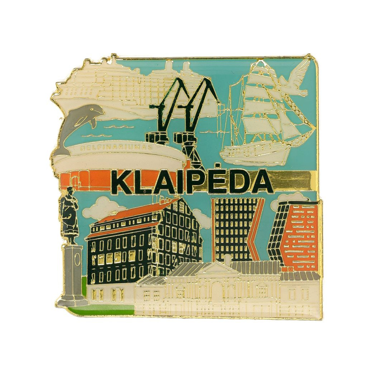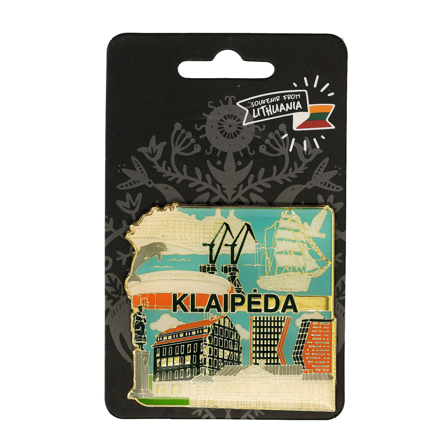 Suvenyrinis metalinis šaldytuvo magnetas su Klaipėdos panoramos vaizdu. Puikus pasirinkimas norintiems prisiminti šį Lietuvos uostamiestį ar papildyti suvenyrų kolekciją.