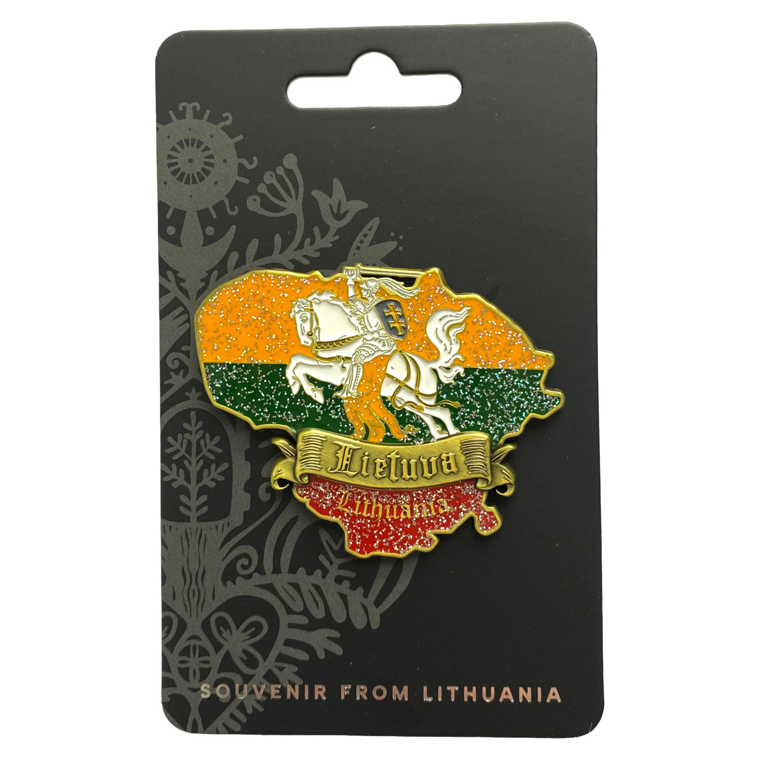 Magnetas Lietuvos kontūras su Vyčiu ir vėliavos spalvomis – patriotiškas suvenyras, puikiai tinkantis keliautojams, kolekcionieriams ir dovanoms.