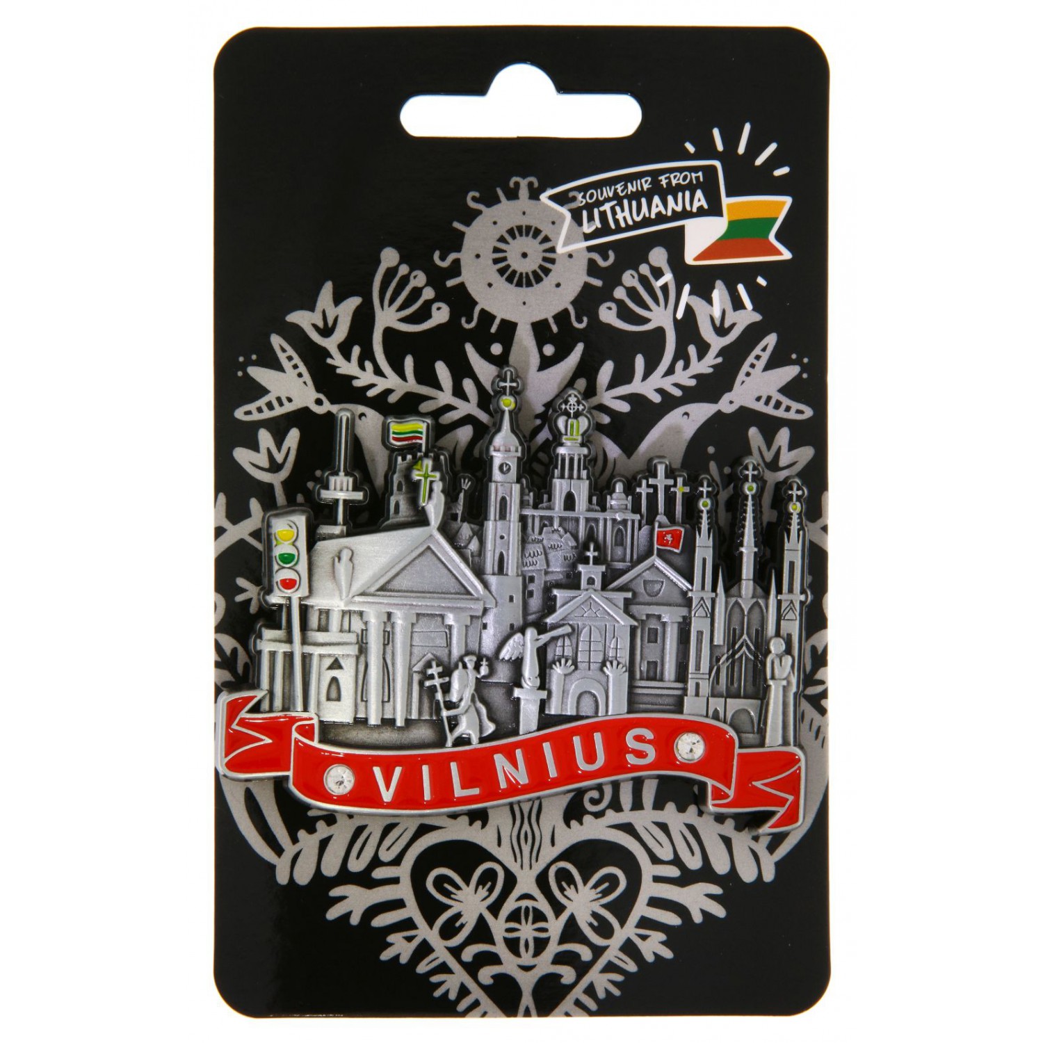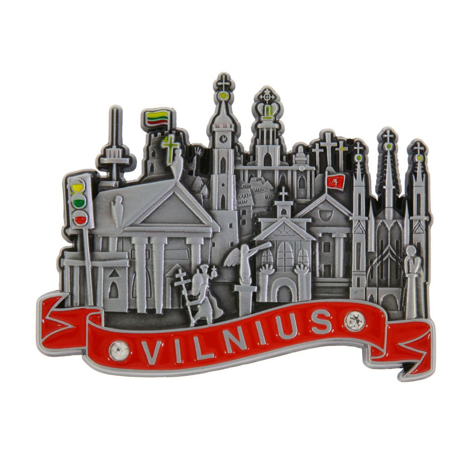 Metalinis suvenyrinis magnetas, vaizduojantis žymiausius Vilniaus architektūros objektus: Katedrą, Trijų Kryžių kalną, Šv. Onos bažnyčią, TV bokštą ir kitus miesto simbolius. Išraiškingas koliažas, perteikiantis sostinės dvasią. Puikus pasirinkimas prekybai suvenyrais.