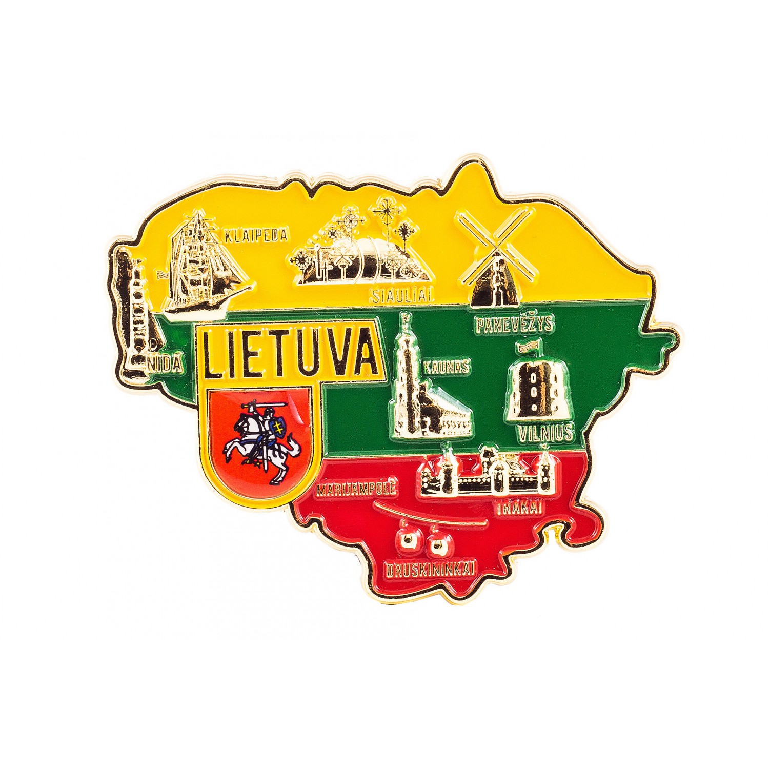 Spalvotas metalinis magnetas Lietuvos žemėlapio formos su miestų simboliais ir herbu. Patvarus, išlaiko spalvą, tinka šaldytuvui ar kitam metaliniam paviršiui. Galima rinktis iš aukso arba vario spalvos.