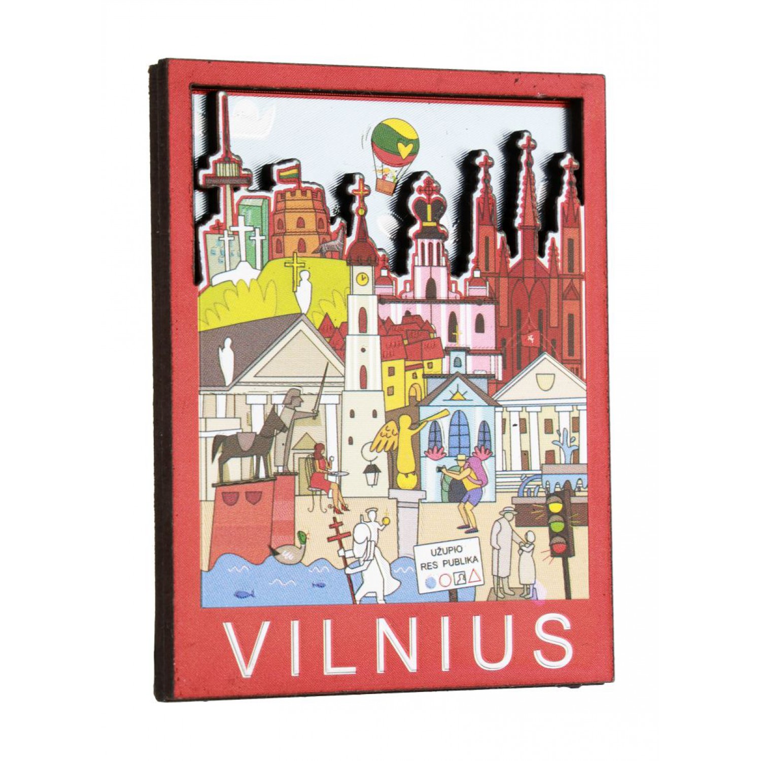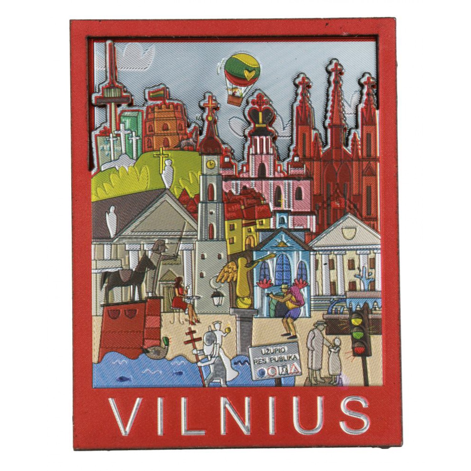 Stačiakampio formos suvenyrinis magnetas su ryškiu Vilniaus miesto koliažu ir blizgiu paviršiumi. Pavaizduoti žymiausi architektūriniai objektai – Gedimino pilies bokštas, Katedra, Šv. Onos bažnyčia, TV bokštas ir kiti miesto simboliai.