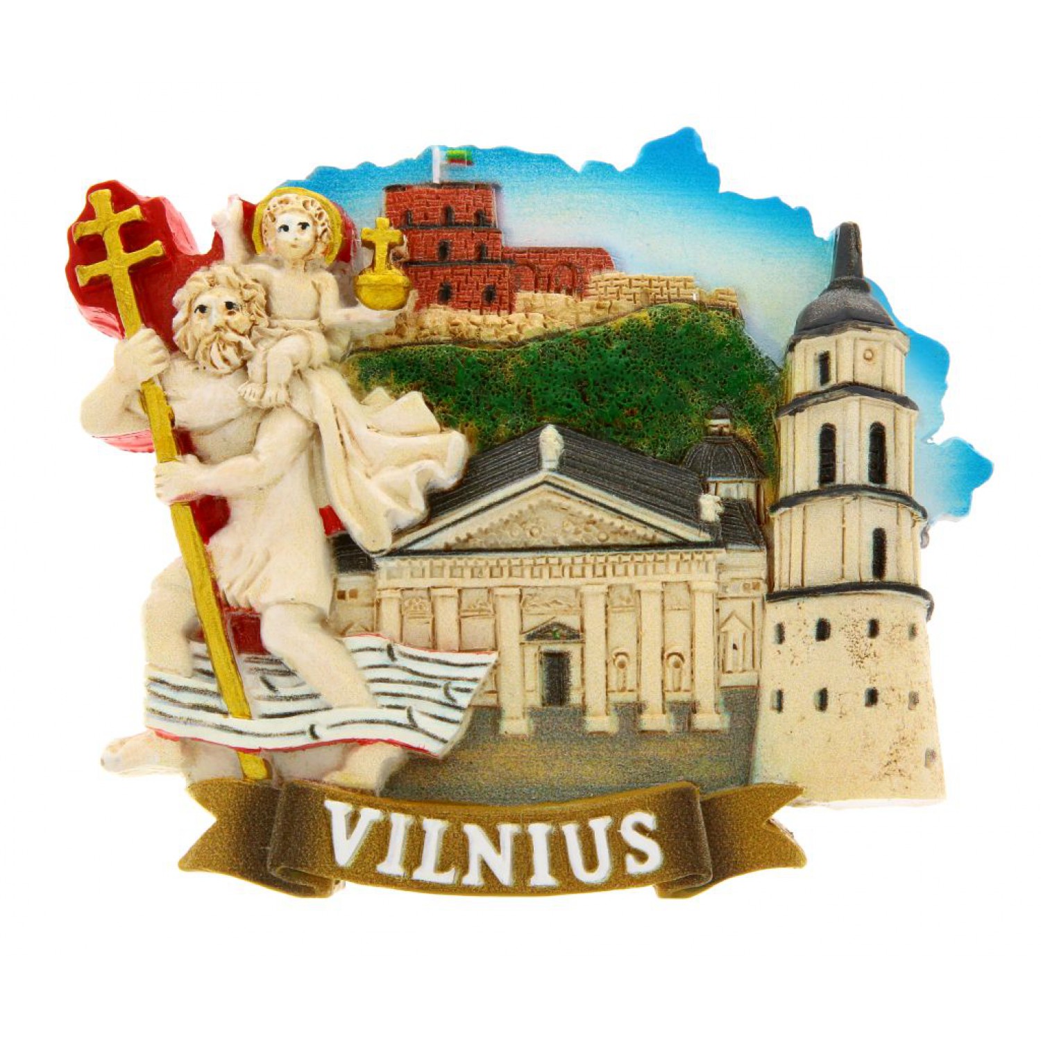 Spalvingas magnetas iš polirezino keramikos, vaizduojantis Vilniaus miesto globėją Šv. Kristoforą, Vilniaus Katedrą, jos varpinę bei Gedimino pilies bokštą su trispalve. Tai aukštos kokybės suvenyras, tinkantis prekybai suvenyrais ir puikiai reprezentuojantis sostinės simboliką.