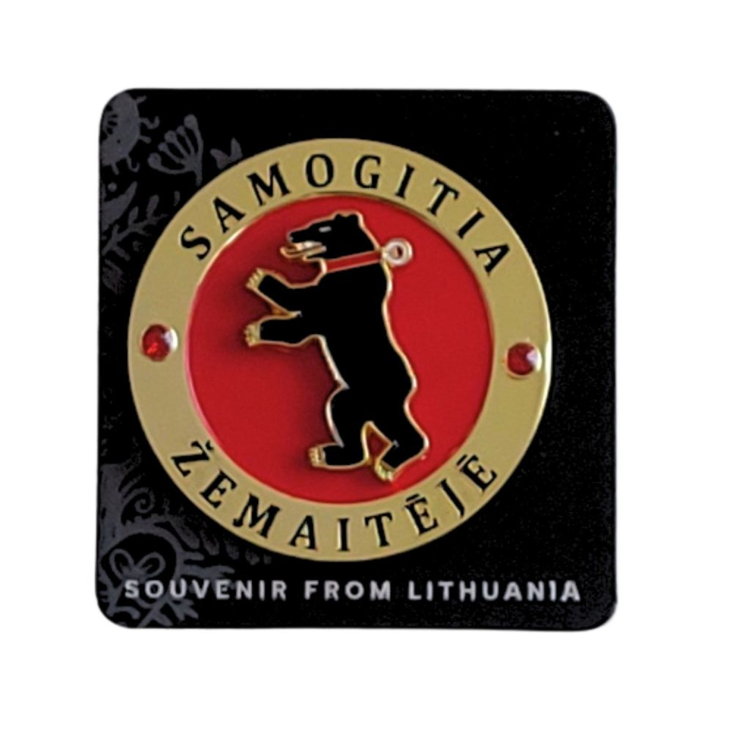 Metalinis šaldytuvo magnetas su Žemaitijos (Samogitia) herbu ir besisukančia meška. Ryškios spalvos, kokybiškas gaminys. Tvirtas ir dekoratyvus suvenyras, tinkamas prekybai.