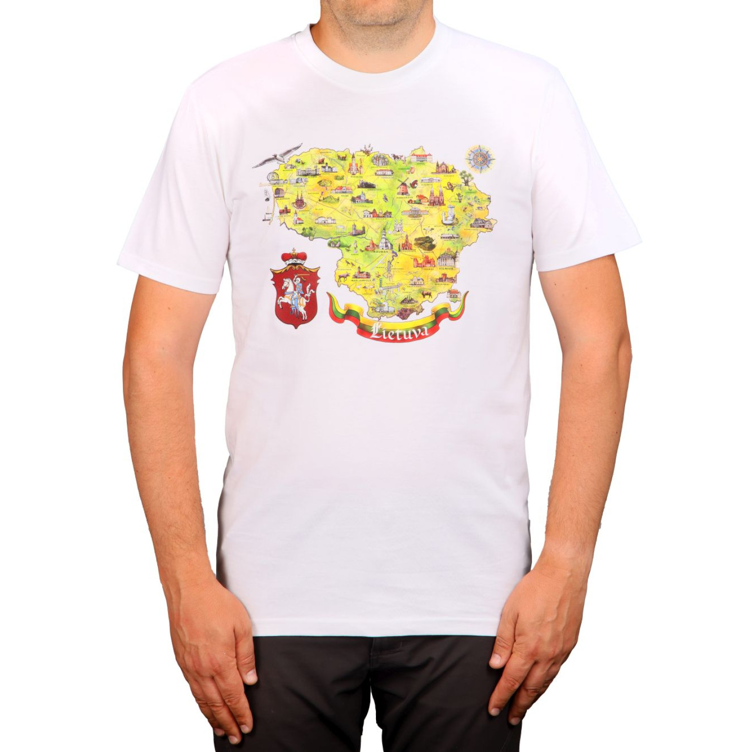Baltos spalvos, medvilniniai marškinėliai Lietuvos žemėlapis, su Lietuvos miestų simboliais ir Vyčiu.