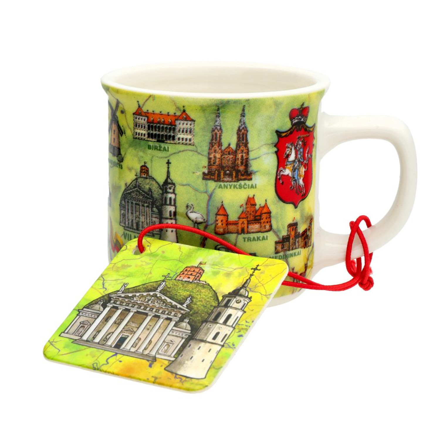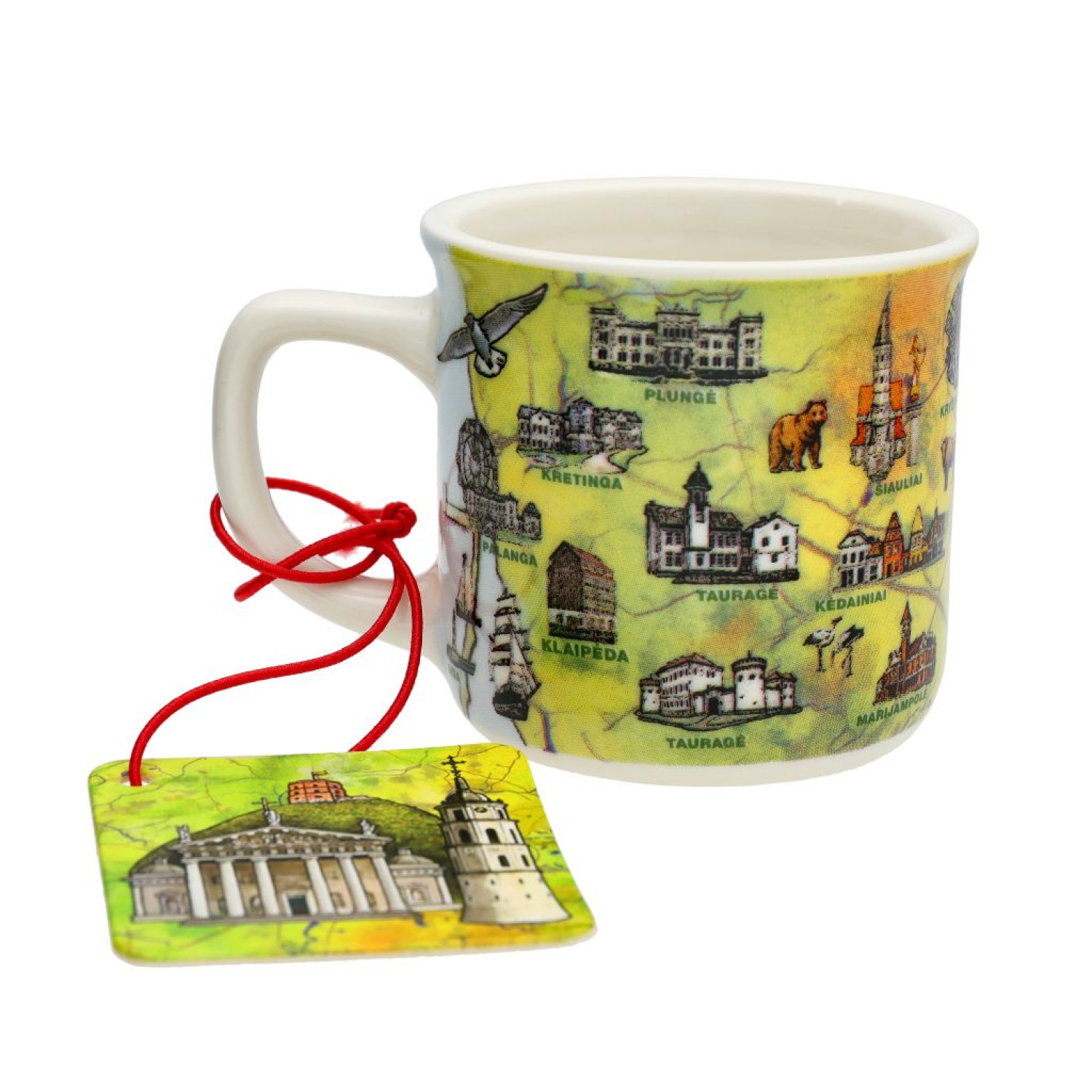 Mažas porcelianinis puodelis suvenyras su Lietuvos žemėlapiu ir miestų simboliais. Ant puodelio pavaizduoti garsiausi šalies miestai, architektūros paminklai bei Lietuvos herbas. Puikiai tinka kaip dovana ar suvenyras prisiminimui iš kelionės po Lietuvą.