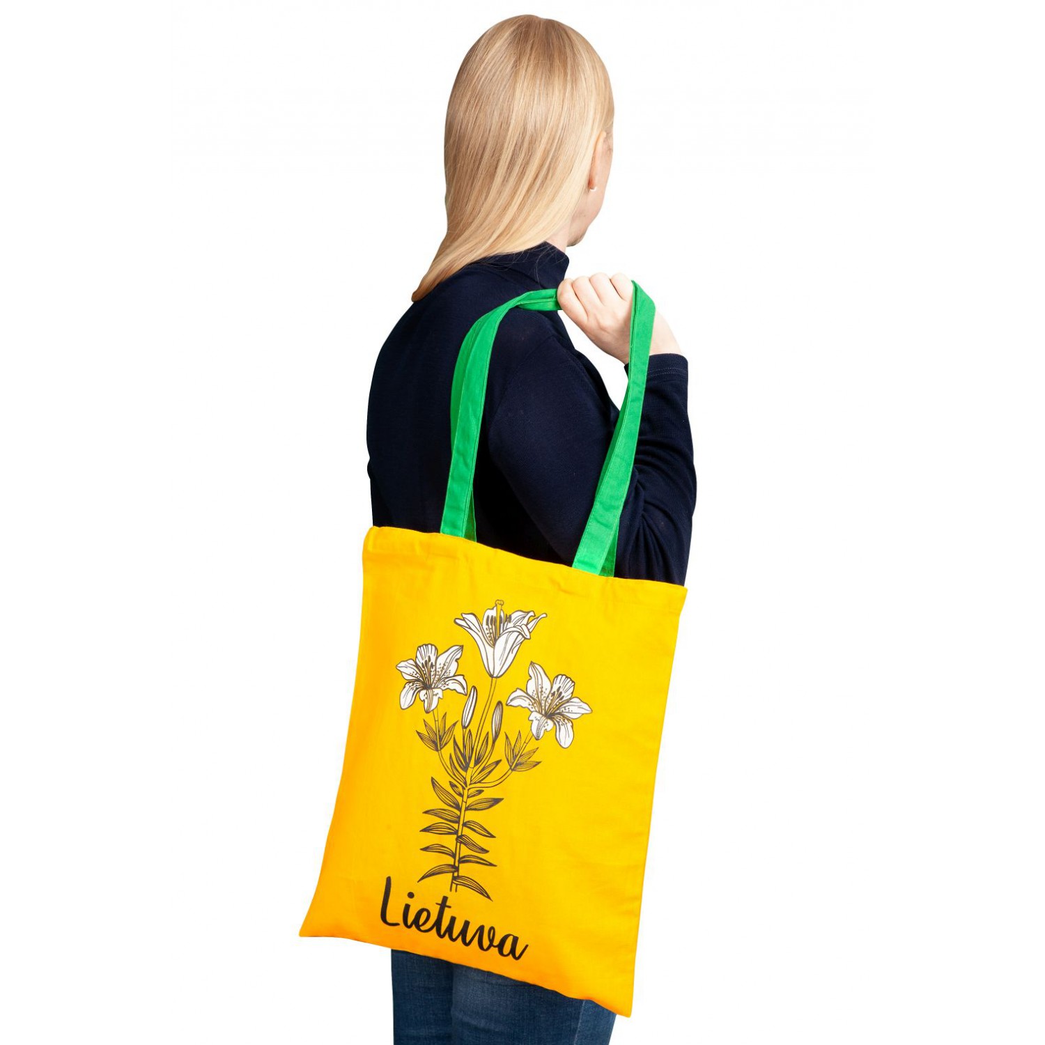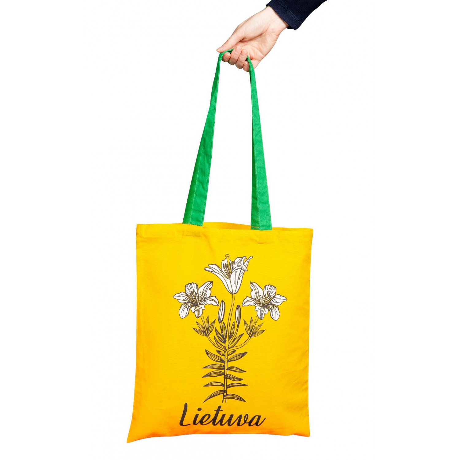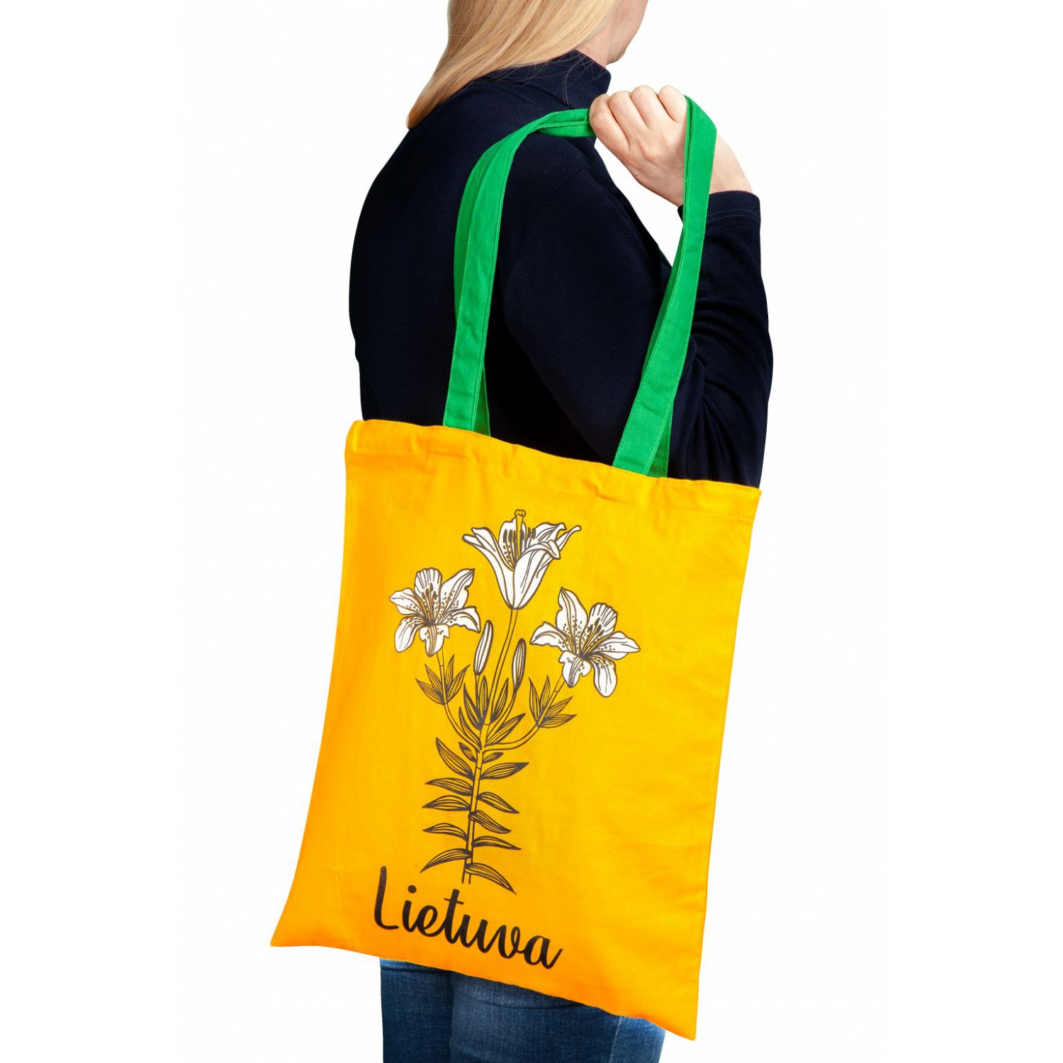 Medvilninis pirkinių maišelis, dekoruotas lelijų motyvais geltoname fone ir užrašu Lietuva. Dydis 35 x 40 cm, rankenos 68 cm, todėl patogiai nešiojamas ant peties. Puikus pasirinkimas kasdieniam pirkinių ar kitų daiktų nešiojimui.