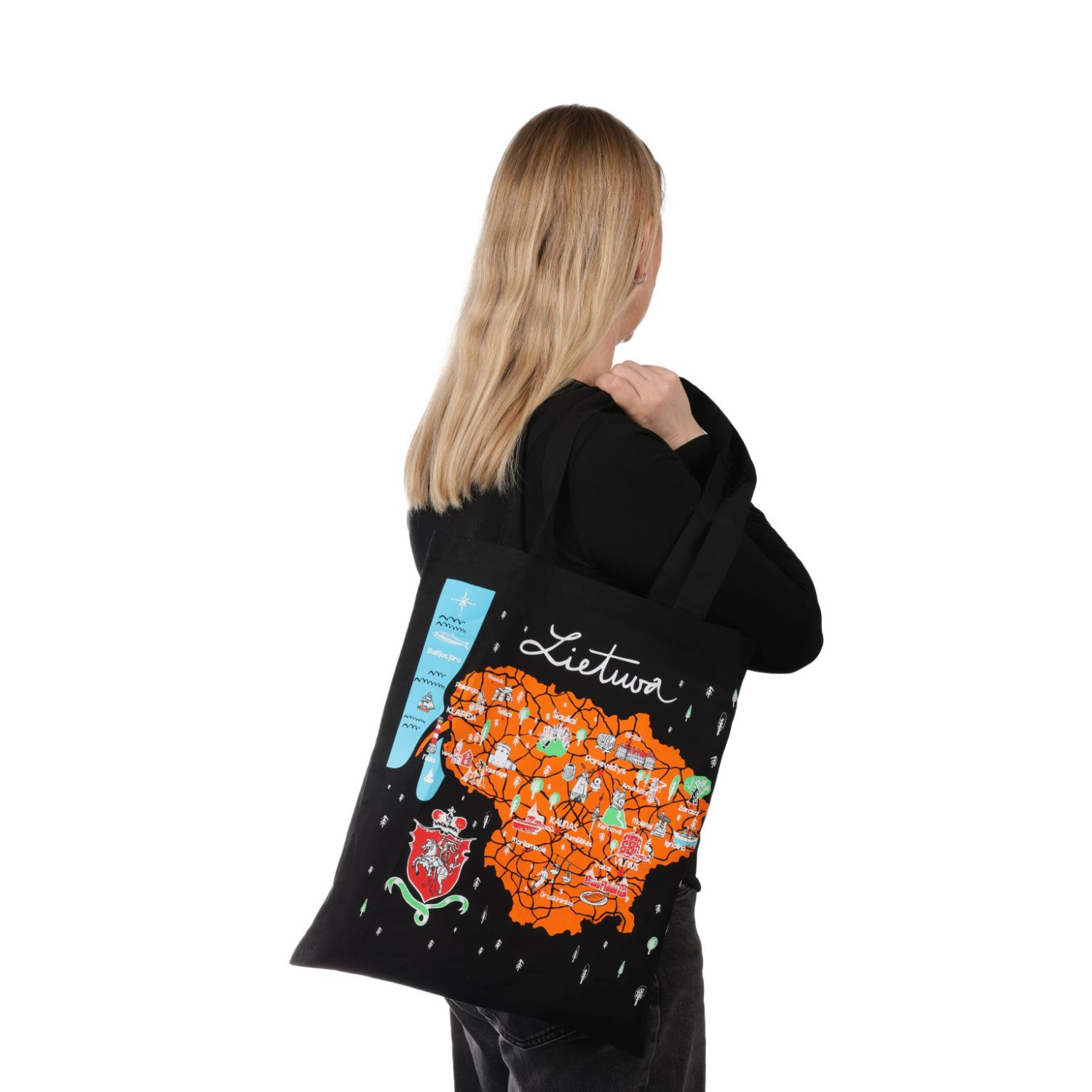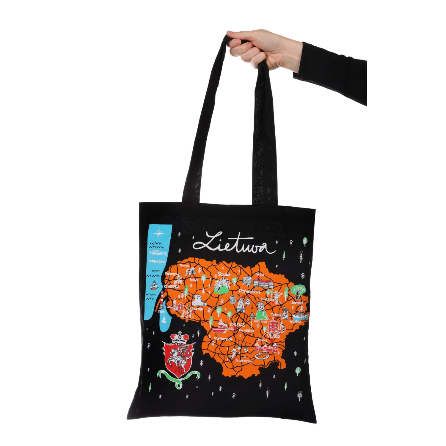 Juodos spalvos medvilninis maišelis, dekoruotas Lietuvos žemėlapio kontūru. Dydis 35 x 40 cm, rankenos 68 cm, todėl patogus nešiojimui ant peties. Suvenyrinis medžiaginis maišelis su Lietuvos kontūru – puikus pasirinkimas kasdieniams pirkiniams ar dovanai.