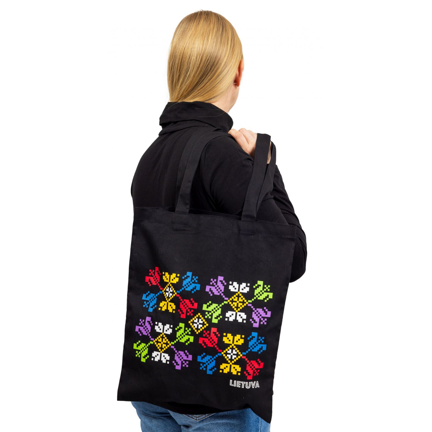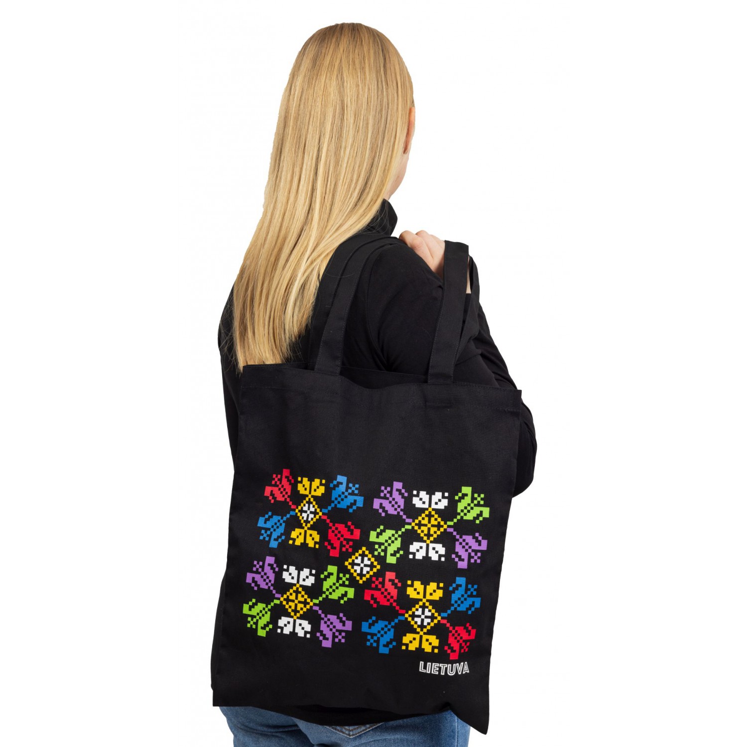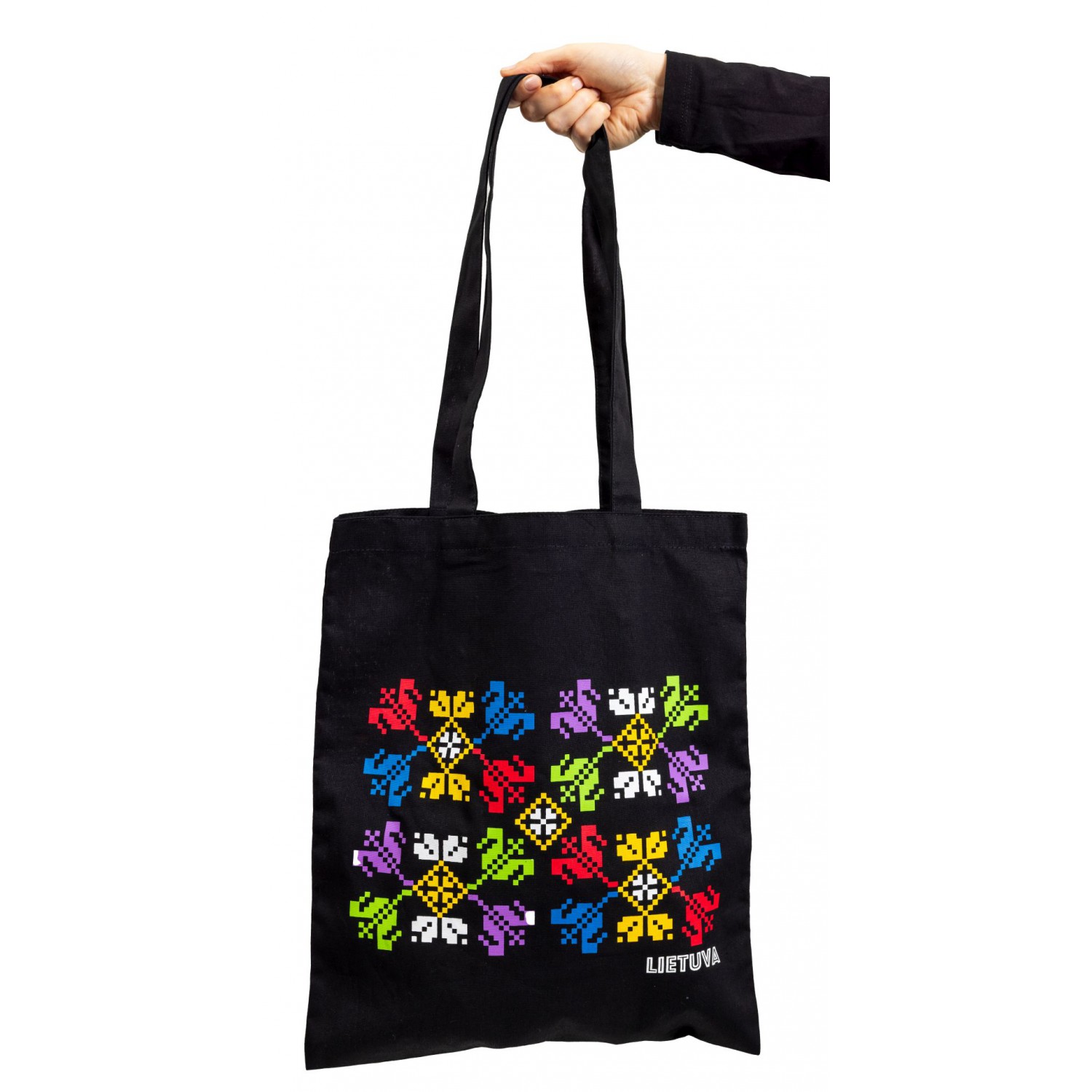 Medvilninis pirkinių maišelis juodos spalvos, dekoruotas tulpėmis. Dydis 35 x 40 cm ir 68 cm ilgio rankenos leidžia patogiai nešioti maišelį ant peties. Pasiūtas iš tvirto medvilnės audinio, maišelis yra patvarus ir puikiai tinka kasdieniams pirkiniams ar kitų daiktų nešiojimui.