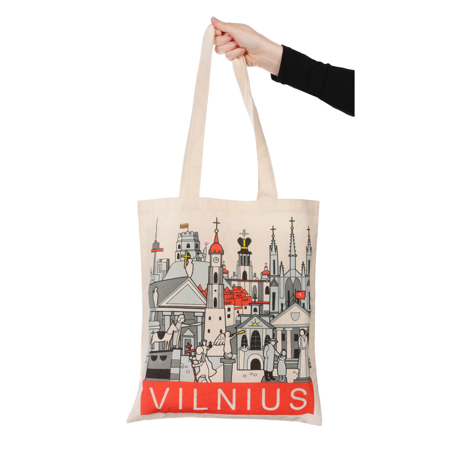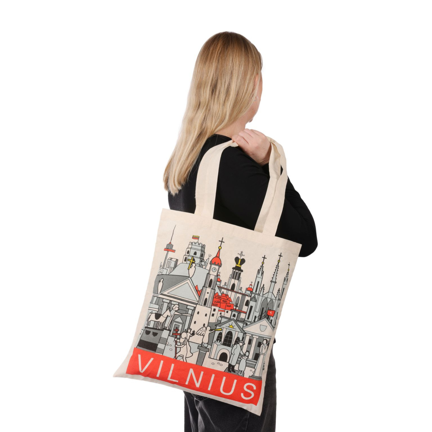 Medžiaginis pirkinių maišelis su Vilniaus miesto vaizdu, kuris puikiai perteikia šalies sostinės grožį ir atmosferą. Pagamintas iš medvilnės, maišelio dydis – 35 x 40 cm, o 68 cm ilgio rankenos užtikrina patogų nešiojimą ant peties. Tai praktiškas ir stilingas pasirinkimas kasdieniams pirkiniams ar kaip suvenyras.