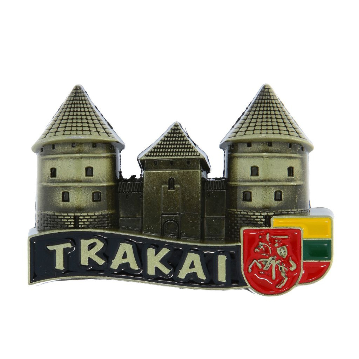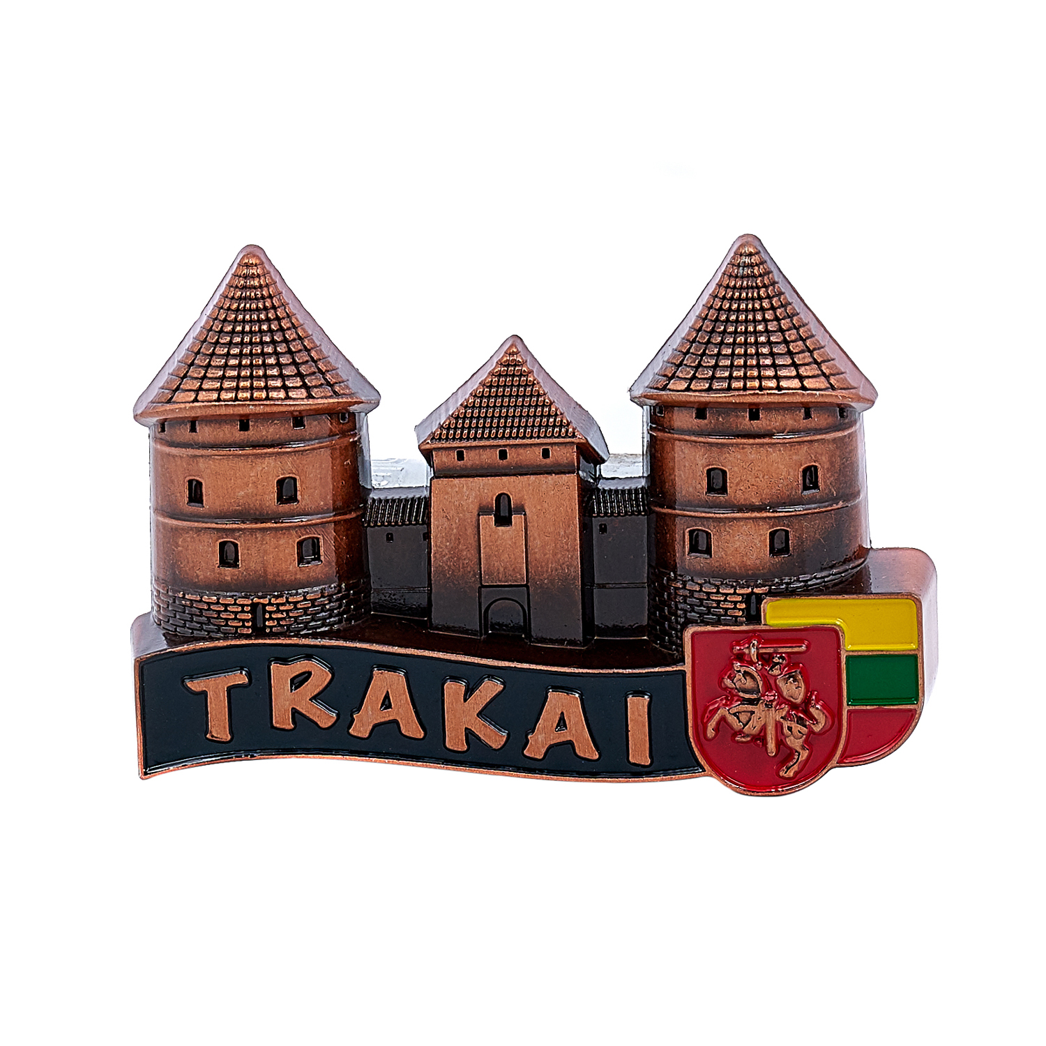Kokybiškas metalinis magnetas su viena žymiausių Lietuvos istorinių vietų – Trakų pilimi. Dekoruotas Lietuvos herbu, trispalve ir užrašu Trakai. Autentiškas suvenyras, puikiai reprezentuojantis Lietuvą. Galimi spalvų variantai – bronzos, vario arba šviesaus vario.