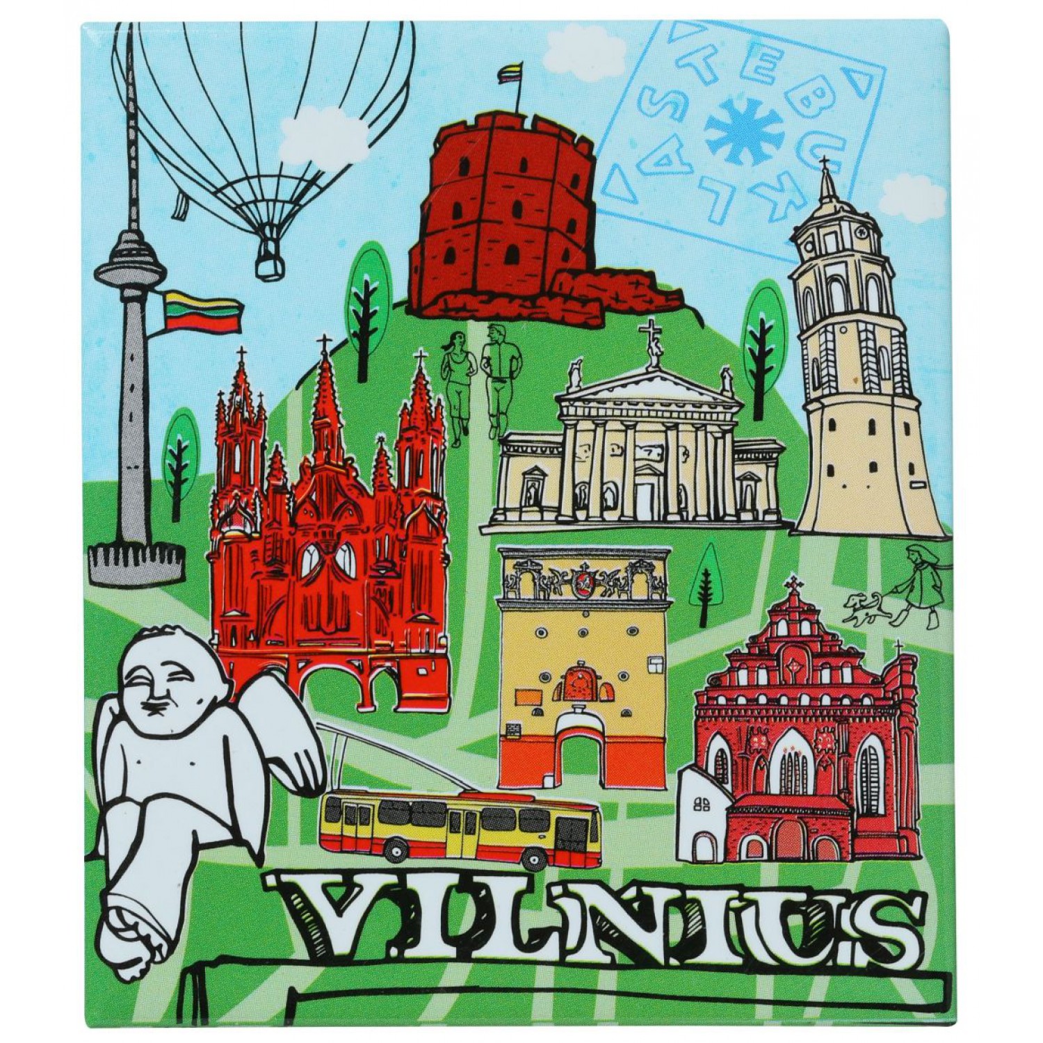 Spalvingas metalinis magnetas su žymiais Vilniaus miesto simboliais: Gedimino pilies bokštu, Šv. Onos bažnyčia, Katedra, ir kitomis architektūrinėmis vertybėmis. Puikus suvenyras, reprezentuojantis Vilniaus kultūrą ir istoriją.